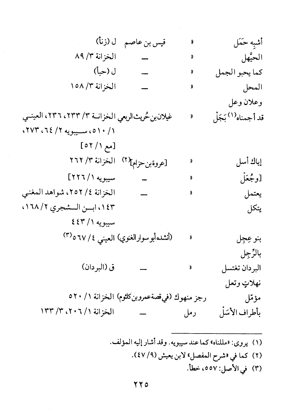 أشبِه حَمَل « قيس بن عاصم ل (زنأ)الحيَّهل « ــ الخزانة ٣/ ٨٩كما يحبو الجمل « ــ ل (حبأ)المحل « ــ الخزانة ٣/ ١٥٨ وعلان وعلقد أجمناه (¬١) بَجَلْ « غيلان بن حُريث الربعي الخزانة ٣/ ٢٣٣، ٢٣٦، العيني ١/ ٥١٠، سيبويه ٢/ ٦٤، ٢٧٣، [مع ١/ ٥٢]إياك أسل « [عروة بن حزام] (¬٢) الخزانة ٣/ ٢٦٢[وجُعَلْ « ــ سيبويه ١/ ٢٢٦]يعتمل يتكل « ــ الخزانة ٤/ ٢٥٢، شواهد المغني ١٤٣، ابن الشجري ٢/ ١٦٨، سيبويه ١/ ٤٤٣ بنو عِجِل بالرِّجِل « (أنشده أبو سوار الغنوي) العيني ٤/ ٥٦٧ (¬٣) البردان تغتسل نهلاتٍ وتعل « ــ ق (البردان) مؤمّل رجز منهوك (في قصة عمرو بن كلثوم) الخزانة ١/ ٥٢٠بأطراف الأسَلْ رمل ــ الخزانة ١/ ٢٠٦، ٣/ ١٣٣