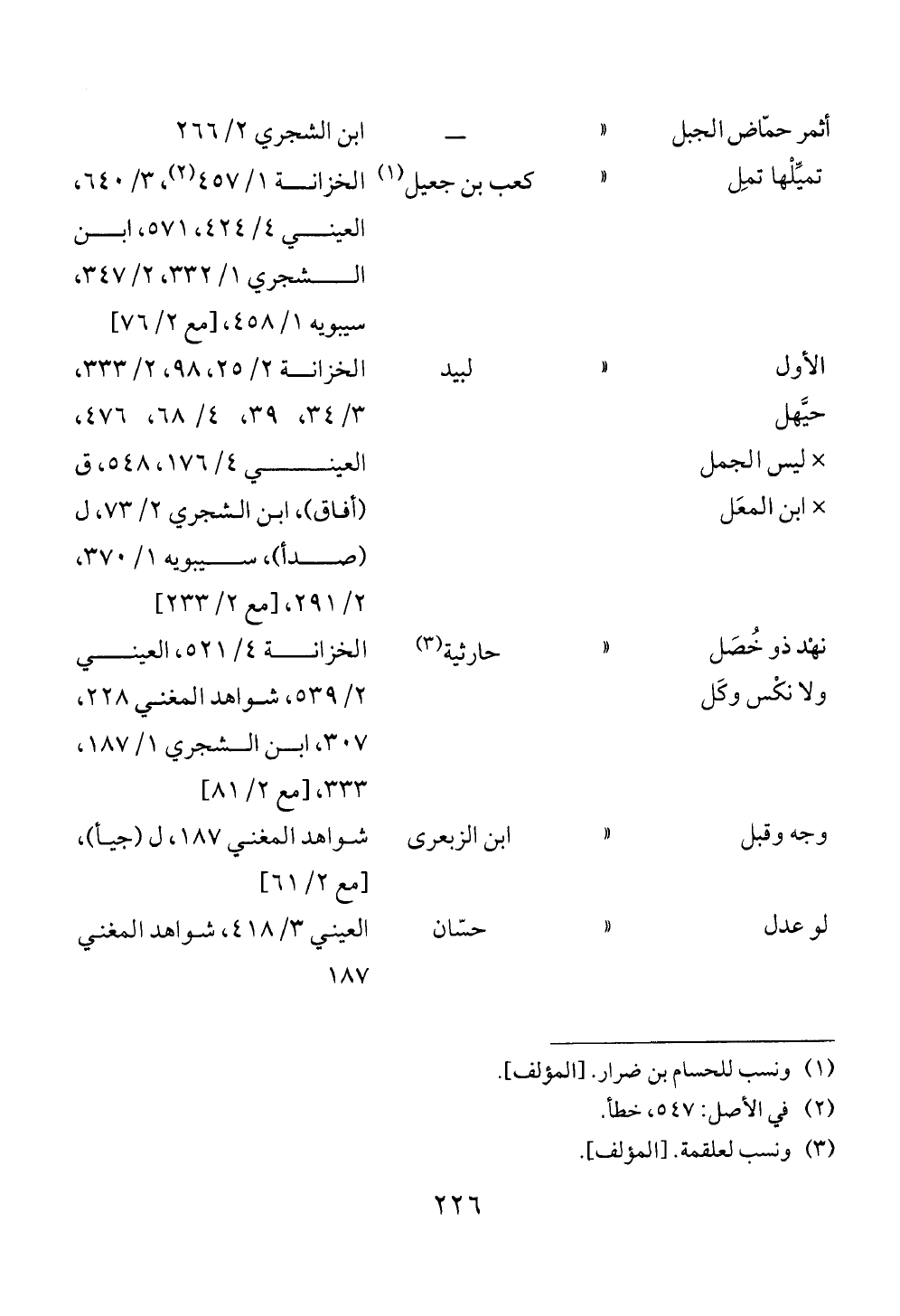 أثمر حمّاض الجبل « ــ ابن الشجري ٢/ ٢٦٦تميِّلْها تمِل « كعب بن جعيل (¬١) الخزانة ١/ ٤٥٧ (¬٢)، ٣/ ٦٤٠، العيني ٤/ ٤٢٤، ٥٧١، ابن الشجري ١/ ٣٣٢، ٢/ ٣٤٧، سيبويه ١/ ٤٥٨، [مع ٢/ ٧٦]الأول حيَّهل × ليس الجمل × ابن المعَل « لبيد الخزانة ٢/ ٢٥، ٩٨، ٢/ ٣٣٣، ٣/ ٣٤، ٣٩، ٤/ ٦٨، ٤٧٦، العيني ٤/ ١٧٦، ٥٤٨، ق (أفاق)، ابن الشجري ٢/ ٧٣، ل (صدأ)، سيبويه ١/ ٣٧٠، ٢/ ٢٩١، [مع ٢/ ٢٣٣] نهْد ذو خُصَل ولا نكْس وكَل « حارثية (¬٣) الخزانة ٤/ ٥٢١، العيني ٢/ ٥٣٩، شواهد المغني ٢٢٨، ٣٠٧، ابن الشجري ١/ ١٨٧، ٣٣٣، [مع ٢/ ٨١] وجه وقبل « ابن الزبعرى شواهد المغني ١٨٧، ل (جيأ)، [مع ٢/ ٦١]لو عدل « حسّان العيني ٣/ ٤١٨، شواهد المغني ١٨٧