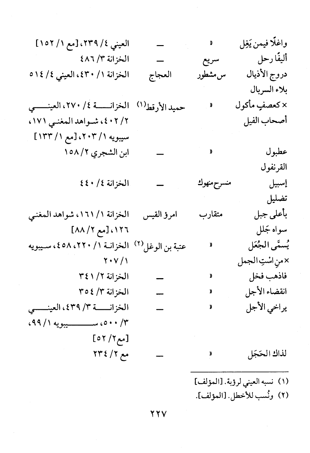 واغلًا فيمن يَغِل « ــ العيني ٤/ ٢٣٩، [مع ١/ ١٥٢]أليفًا رحل سريع ــ الخزانة ٣/ ٤٨٦دروج الأذيال بلاء السربال س مشطور العجاج الخزانة ١/ ٤٣٠، العيني ٤/ ٥١٤× كعصفٍ مأكولأصحاب الفيل « حميد الأرقط (¬١) الخزانة ٤/ ٢٧٠، العيني ٢/ ٤٠٢، شواهد المغني ١٧١، سيبويه ١/ ٢٠٣، [مع ١/ ١٣٣] عطبولالقرنفول « ــ ابن الشجري ٢/ ١٥٨ إسبيلتضليل منسرح منهوك ــ الخزانة ٤/ ٤٤٠ بأعلى جبل سواه جَلل متقارب امرؤ القيس الخزانة ١/ ١٦١، شواهد المغني ١٢٦، [مع ٢/ ٨٨] يُسمَّى الجُعَل× منِ اسْتِ الجمل « عتبة بن الوغل (¬٢) الخزانة ١/ ٢٢٠، ٤٥٨، سيبويه ١/ ٢٠٧ فاذهب فخل « ــ الخزانة ٢/ ٣٤١انقضاء الأجل « ــ الخزانة ٣/ ٣٥٤يراخي الأجل « ــ الخزانة ٣/ ٤٣٩، العيني ٣/ ٥٠٠، سيبويه ١/ ٩٩، [مع ٢/ ٥٢]لذاك الحَجَل « ــ مع ٢/ ٢٣٤