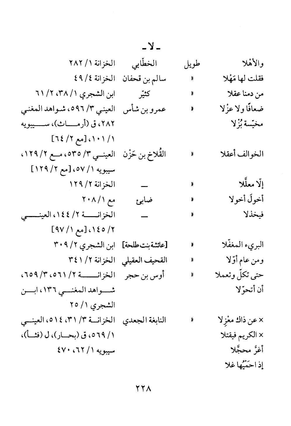 والأهْلا طويل الخطّابي الخزانة ١/ ٢٨٢فقلت لها مَهْلا « سالم بن قحفان الخزانة ٤/ ٤٩من دمنا عقلا « كثيّر ابن الشجري ١/ ٣٨، ٢/ ٦١ضعافًا ولا عزْلا مخيّسة بُزْلا « عمرو بن شأس العيني ٣/ ٥٩٦، شواهد المغني ٢٨٢، ق (أرماث)، سيبويه ١/ ١٠١، [مع ٢/ ٦٤]الخوالف أعقلا « القُلاخ بن حَزْن العيني ٣/ ٥٣٥، مع ٢/ ١٢٩، سيبويه ١/ ٥٧، [مع ٢/ ١٢٩]إلّا معلَّلا « ــ الخزانة ٢/ ١٢٩أخولَ أخولا « ضابئ مع ١/ ٢٠٨فيخذلا « ــ الخزانة ٢/ ١٤٤، العيني ٢/ ١٤٥، [مع ١/ ٩٧]البريء المغفّلا « [عائشة بنت طلحة] ابن الشجري ٢/ ٣٠٩ومن عام أوّلا « القحيف العقيلي الخزانة ٢/ ٣٤١حتى تكلّ وتعملا أن أتحوّلا « أوس بن حجر الخزانة ٢/ ٥٦١، ٣/ ٦٥٩، شواهد المغني ١٣٦، ابن الشجري ١/ ٢٥ × عن ذاك معْزِلا× الكريم فيقتلا أغرَّ محجَّلا إذ احَمْيُها غلا « النابغة الجعدي الخزانة ٣/ ٣١، ٥١٤، العيني ١/ ٥٦٩، ق (بحار)، ل (فثأ)، سيبويه ١/ ٦٢، ٤٧٠