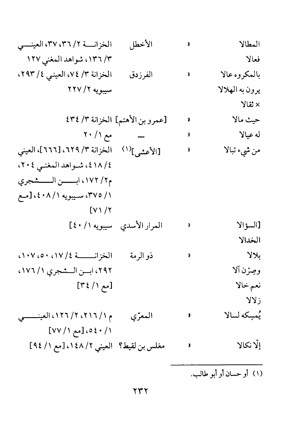 المطالا فعالا « الأخطل الخزانة ٢/ ٣٦، ٣٧، العيني ٣/ ١٣٦، شواهد المغني ١٢٧ بالمكروه عالا يرون به الهلالا × ثقالا « الفرزدق الخزانة ٣/ ٧٤، العيني ٤/ ٢٩٣، سيبويه ٢/ ٢٢٧ حيث مالا « [عمرو بن الأهتم] الخزانة ٣/ ٤٣٤له عيالا « ــ مع ١/ ٢٠من شيء تبالا « [الأعشى] (¬١) الخزانة ٣/ ٦٢٩، [٦٦٦]، العيني ٤/ ٤١٨، شواهد المغني ٢٠٤، م ٢/ ١٧٢، ابن الشجري ١/ ٣٧٥، سيبويه ١/ ٤٠٨، [مع ٢/ ٧١][السؤالا الخدالا « المرار الأسدي سيبويه ١/ ٤٠] بلالا وصِرْن آلا نعم خالا زلالا « ذو الرمة الخزانة ٤/ ١٧، ٥٠، ١٠٧، ٢٩٢، ابن الشجري ١/ ١٧٦، [مع ١/ ٣٤] يُمسِكه لسالا « المعرّي م ١/ ٢١٦، ٢/ ١٢٦، العيني ١/ ٥٤٠، [مع ١/ ٧٧]إلّا نكالا « مغلس بن لقيط؟ العيني ٢/ ١٤٨، [مع ١/ ٩٤]