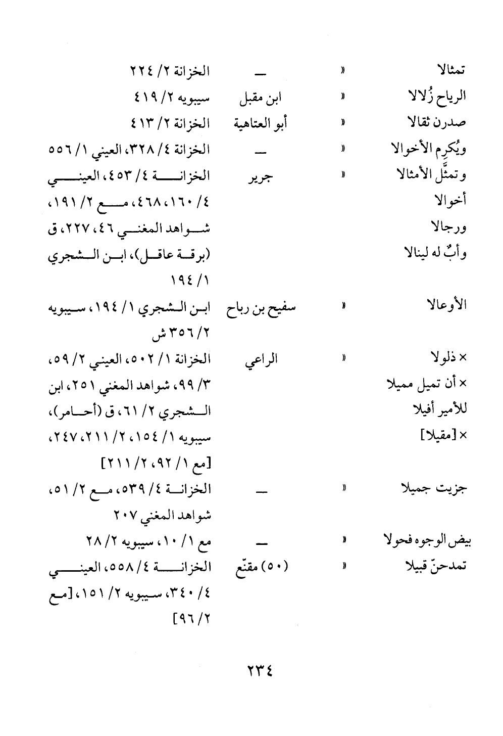 تمثالا « ــ الخزانة ٢/ ٢٢٤الرياح زُلالا « ابن مقبل سيبويه ٢/ ٤١٩صدرن ثقالا « أبو العتاهية الخزانة ٢/ ٤١٣ويُكرِم الأخوالا « ــ الخزانة ٤/ ٣٢٨، العيني ١/ ٥٥٦وتمثَّل الأمثالا أخوالا ورجالا وأبٌ له لينالا « جرير الخزانة ٤/ ٤٥٣، العيني ٤/ ١٦٠، ٤٦٨، مع ٢/ ١٩١، شواهد المغني ٤٦، ٢٢٧، ق (برقة عاقل)، ابن الشجري ١/ ١٩٤ الأوعالا « سفيح بن رباح ابن الشجري ١/ ١٩٤، سيبويه ٢/ ٣٥٦ ش× ذلولا × أن تميل مميلا للأمير أفيلا × [مقيلا] « الراعي الخزانة ١/ ٥٠٢، العيني ٢/ ٥٩، ٣/ ٩٩، شواهد المغني ٢٥١، ابن الشجري ٢/ ٦١، ق (أحامر)، سيبويه ١/ ١٥٤، ٢/ ٢١١، ٢٤٧، [مع ١/ ٩٢، ٢/ ٢١١] جزيت جميلا « ــ الخزانة ٤/ ٥٣٩، مع ٢/ ٥١، شواهد المغني ٢٠٧بيض الوجوه فحولا « ــ مع ١/ ١٠، سيبويه ٢/ ٢٨تمدحنّ قبيلا « (٥٠) مقنّع الخزانة ٤/ ٥٥٨، العيني ٤/ ٣٤٠، سيبويه ٢/ ١٥١، [مع ٢/ ٩٦]