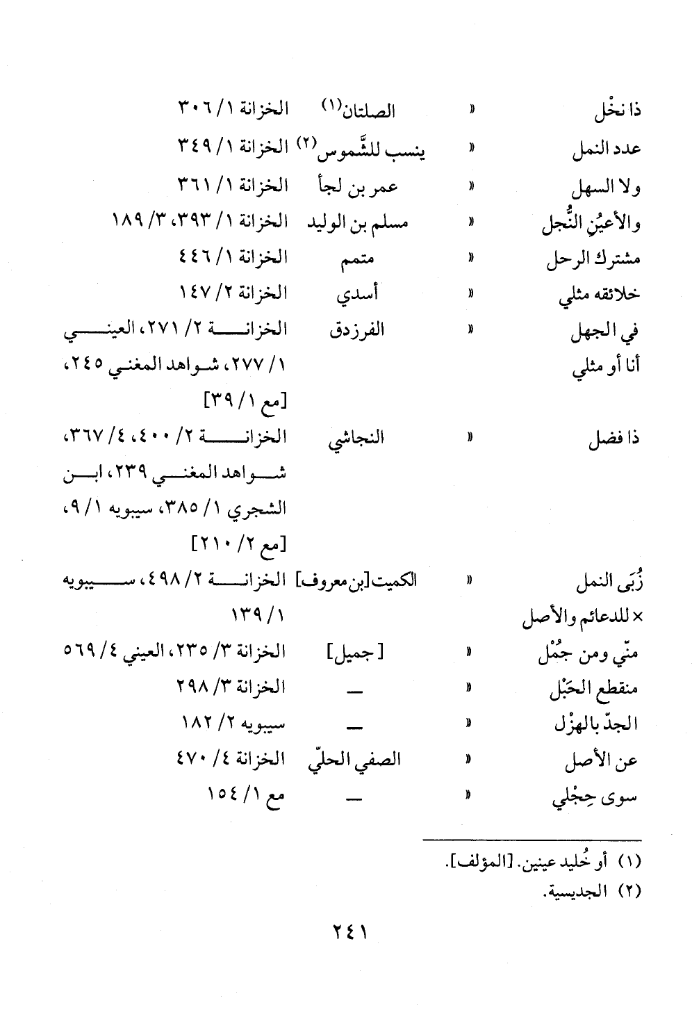 ذا نخْل « الصلتان (¬١) الخزانة ١/ ٣٠٦عدد النمل « ينسب للشَّموس (¬٢) الخزانة ١/ ٣٤٩ولا السهل « عمر بن لجأ الخزانة ١/ ٣٦١والأعيُنِ النُّجل « مسلم بن الوليد الخزانة ١/ ٣٩٣، ٣/ ١٨٩مشترك الرحل « متمم الخزانة ١/ ٤٤٦خلائقه مثلي « أسدي الخزانة ٢/ ١٤٧في الجهل أنا أو مثلي « الفرزدق الخزانة ٢/ ٢٧١، العيني ١/ ٢٧٧، شواهد المغني ٢٤٥، [مع ١/ ٣٩] ذا فضل « النجاشي الخزانة ٢/ ٤٠٠، ٤/ ٣٦٧، شواهد المغني ٢٣٩، ابن الشجري ١/ ٣٨٥، سيبويه ١/ ٩، [مع ٢/ ٢١٠]زُبَى النمل× للدعائم والأصل « الكميت [بن معروف] الخزانة ٢/ ٤٩٨، سيبويه ١/ ١٣٩ منّي ومن جُمْل « [جميل] الخزانة ٣/ ٢٣٥، العيني ٤/ ٥٦٩منقطع الحَبْل « ــ الخزانة ٣/ ٢٩٨الجدّ بالهزْل « ــ سيبويه ٢/ ١٨٢عن الأصل « الصفي الحلّي الخزانة ٤/ ٤٧٠سوى حِجْلي « ــ مع ١/ ١٥٤