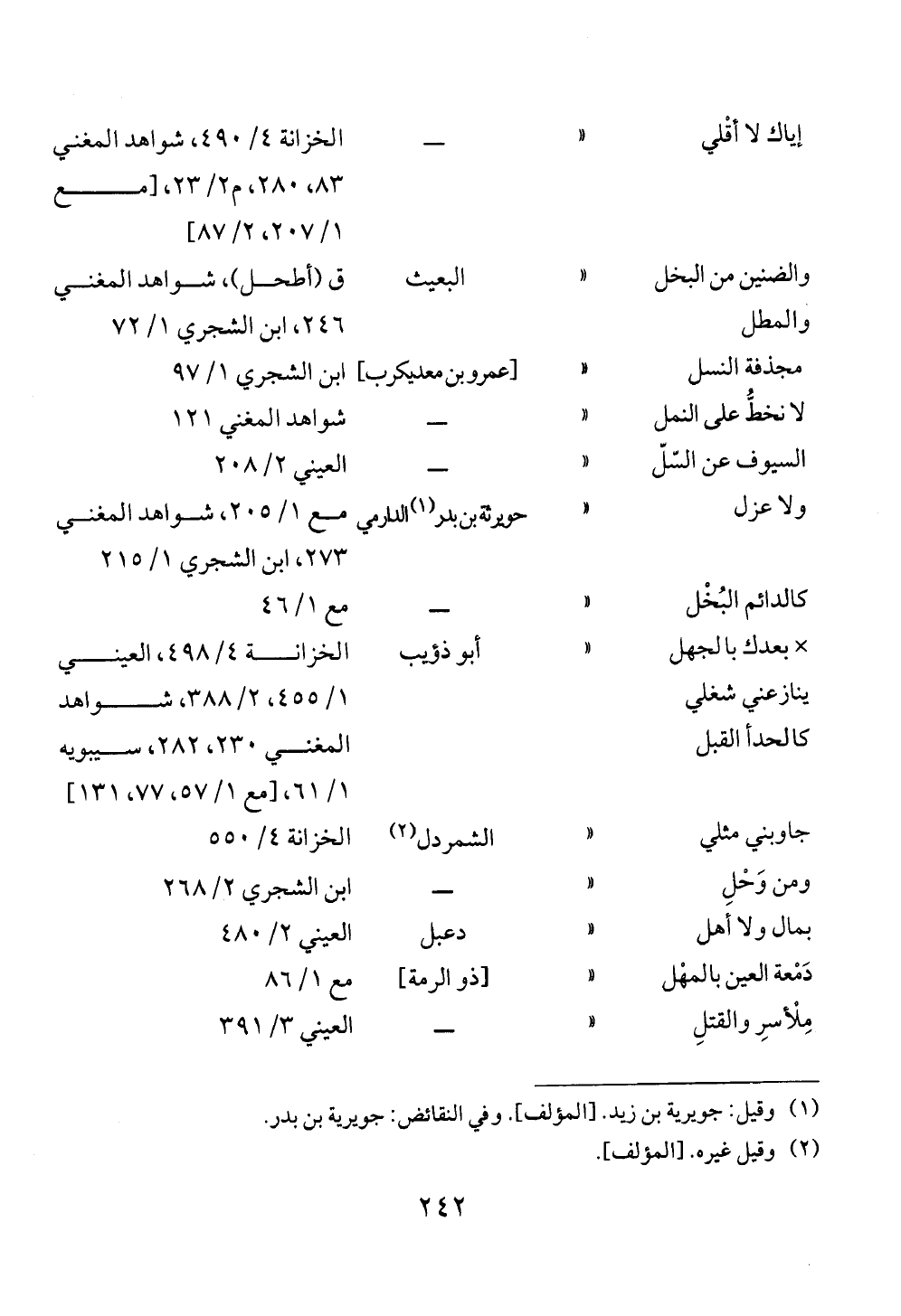 إياك لا أقْلي « ــ الخزانة ٤/ ٤٩٠، شواهد المغني ٨٣، ٢٨٠، م ٢/ ٢٣، [مع ١/ ٢٠٧، ٢/ ٨٧]والضنين من البخل والمطل « البعيث ق (أطحل)، شواهد المغني ٢٤٦، ابن الشجري ١/ ٧٢ مجذفة النسل « [عمرو بن معديكرب] ابن الشجري ١/ ٩٧لا نخطُّ على النمل « ــ شواهد المغني ١٢١السيوف عن السّلّ « ــ العيني ٢/ ٢٠٨ولا عزل « حويرثة بن بدر (¬١) الدارمي مع ١/ ٢٠٥، شواهد المغني ٢٧٣، ابن الشجري ١/ ٢١٥كالدائم البُخْل « ــ مع ١/ ٤٦× بعدك بالجهل ينازعني شغلي كالحدأ القبل « أبو ذؤيب الخزانة ٤/ ٤٩٨، العيني ١/ ٤٥٥، ٢/ ٣٨٨، شواهد المغني ٢٣٠، ٢٨٢، سيبويه ١/ ٦١، [مع ١/ ٥٧، ٧٧، ١٣١] جاوبني مثلي « الشمردل (¬٢) الخزانة ٤/ ٥٥٠ومن وَحْلِ « ــ ابن الشجري ٢/ ٢٦٨بمال ولا أهل « دعبل العيني ٢/ ٤٨٠دَمْعة العين بالمهْل « [ذو الرمة] مع ١/ ٨٦مِلْأسرِ والقتلِ « ــ العيني ٣/ ٣٩١