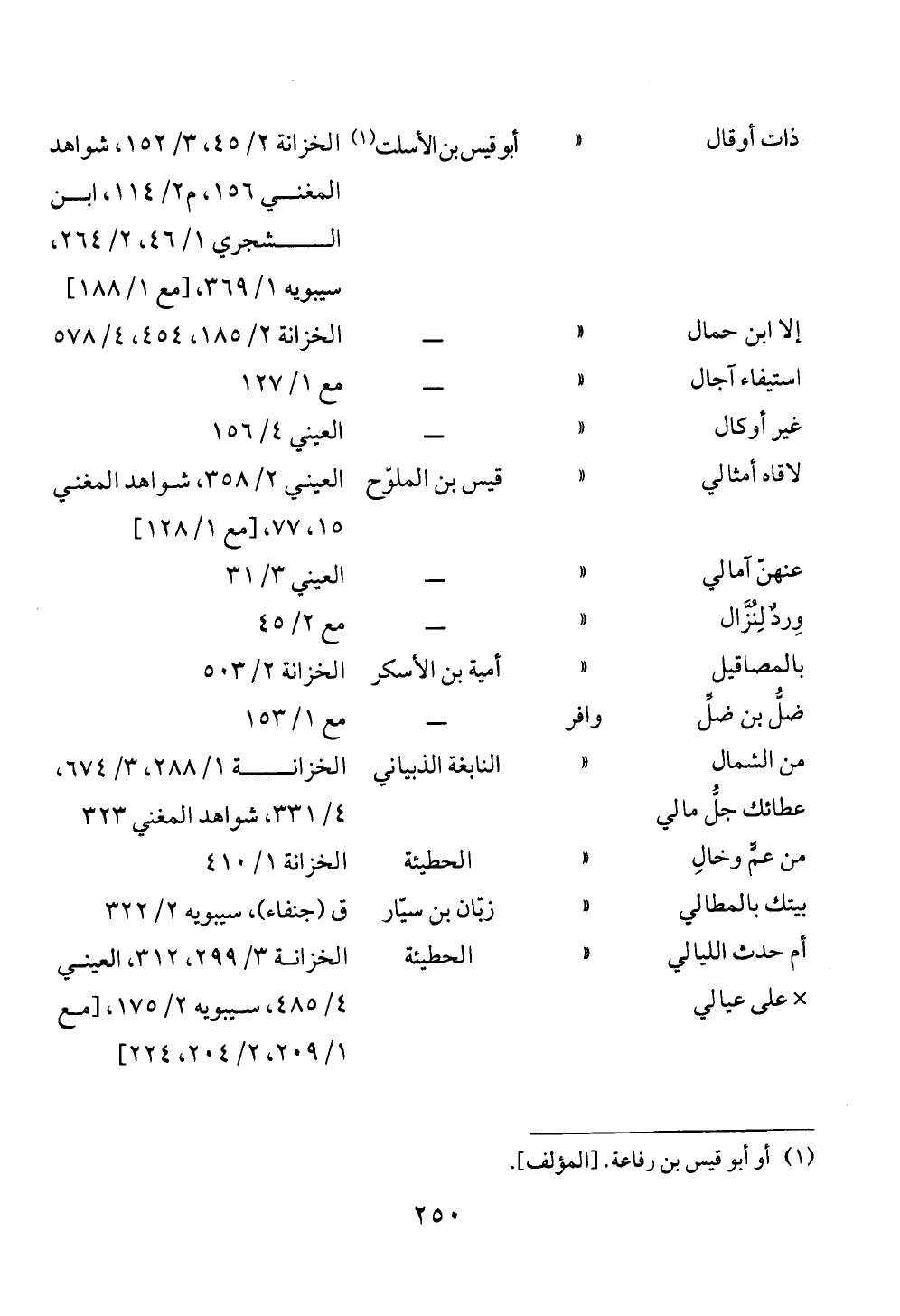 ذات أوقال « أبو قيس بن الأسلت (¬١) الخزانة ٢/ ٤٥، ٣/ ١٥٢، شواهد المغني ١٥٦، م ٢/ ١١٤، ابن الشجري ١/ ٤٦، ٢/ ٢٦٤، سيبويه ١/ ٣٦٩، [مع ١/ ١٨٨]إلا ابن حمال « ــ الخزانة ٢/ ١٨٥، ٤٥٤، ٤/ ٥٧٨استيفاء آجال « ــ مع ١/ ١٢٧غير أوكال « ــ العيني ٤/ ١٥٦لاقاه أمثالي « قيس بن الملوّح العيني ٢/ ٣٥٨، شواهد المغني ١٥، ٧٧، [مع ١/ ١٢٨]عنهنّ آمالي « ــ العيني ٣/ ٣١وِردٌ لِنُزَّال « ــ مع ٢/ ٤٥بالمصاقيل « أمية بن الأسكر الخزانة ٢/ ٥٠٣ضلُّ بن ضلِّ وافر ــ مع ١/ ١٥٣من الشمالعطائك جلُّ مالي « النابغة الذبياني الخزانة ١/ ٢٨٨، ٣/ ٦٧٤، ٤/ ٣٣١، شواهد المغني ٣٢٣ من عمٍّ وخالِ « الحطيئة الخزانة ١/ ٤١٠بيتك بالمطالي « زبّان بن سيّار ق (جنفاء)، سيبويه ٢/ ٣٢٢أم حدث الليالي× على عيالي « الحطيئة الخزانة ٣/ ٢٩٩، ٣١٢، العيني ٤/ ٤٨٥، سيبويه ٢/ ١٧٥، [مع ١/ ٢٠٩، ٢/ ٢٠٤، ٢٢٤]