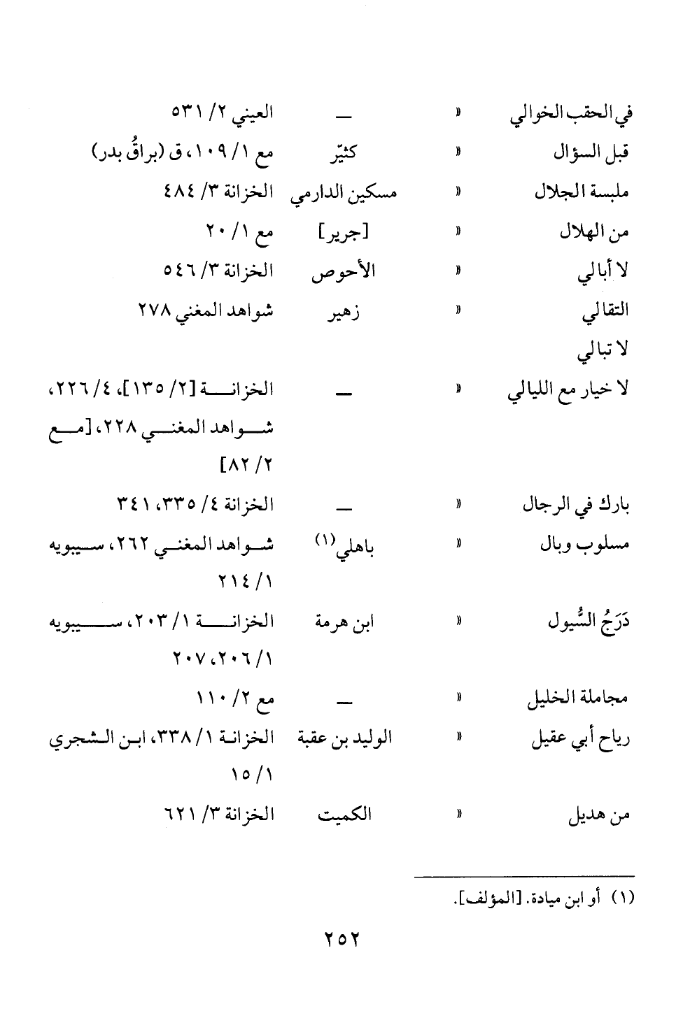 في الحقب الخوالي « ــ العيني ٢/ ٥٣١قبل السؤال « كثيّر مع ١/ ١٠٩، ق (براقُ بدر)ملبسة الجلال « مسكين الدارمي الخزانة ٣/ ٤٨٤من الهلال « [جرير] مع ١/ ٢٠لا أبالي « الأحوص الخزانة ٣/ ٥٤٦التقالي لا تبالي « زهير شواهد المغني ٢٧٨ لا خيار مع الليالي « ــ الخزانة [٢/ ١٣٥]، ٤/ ٢٢٦، شواهد المغني ٢٢٨، [مع ٢/ ٨٢]بارك في الرجال « ــ الخزانة ٤/ ٣٣٥، ٣٤١مسلوب وبال « باهلي (¬١) شواهد المغني ٢٦٢، سيبويه ١/ ٢١٤دَرَجُ السُّيول « ابن هرمة الخزانة ١/ ٢٠٣، سيبويه ١/ ٢٠٦، ٢٠٧مجاملة الخليل « ــ مع ٢/ ١١٠رياح أبي عقيل « الوليد بن عقبة الخزانة ١/ ٣٣٨، ابن الشجري ١/ ١٥من هديل « الكميت الخزانة ٣/ ٦٢١