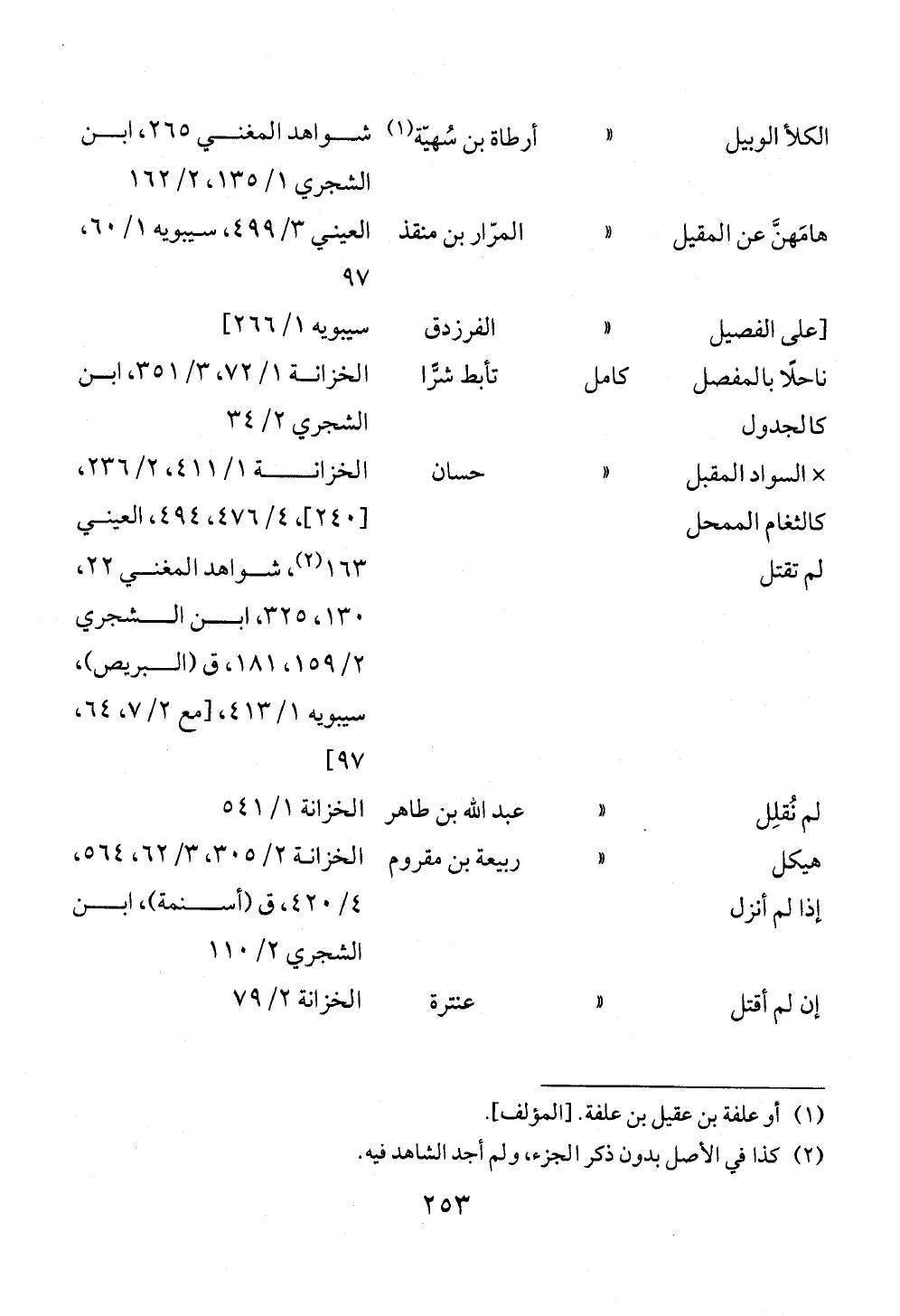 الكلأ الوبيل « أرطاة بن سُهيّة (¬١) شواهد المغني ٢٦٥، ابن الشجري ١/ ١٣٥، ٢/ ١٦٢هامَهنَّ عن المقيل « المرّار بن منقذ العيني ٣/ ٤٩٩، سيبويه ١/ ٦٠، ٩٧[على الفصيل « الفرزدق سيبويه ١/ ٢٦٦]ناحلًا بالمفصل كالجدول كامل تأبط شرًّا الخزانة ١/ ٧٢، ٣/ ٣٥١، ابن الشجري ٢/ ٣٤ × السواد المقبل كالثغام الممحل لم تقتل « حسان الخزانة ١/ ٤١١، ٢/ ٢٣٦، [٢٤٠]، ٤/ ٤٧٦، ٤٩٤، العيني ١٦٣ (¬٢)، شواهد المغني ٢٢، ١٣٠، ٣٢٥، ابن الشجري ٢/ ١٥٩، ١٨١، ق (البريص)، سيبويه ١/ ٤١٣، [مع ٢/ ٧، ٦٤، ٩٧] لم نُقلِل « عبد الله بن طاهر الخزانة ١/ ٥٤١هيكل إذا لم أنزل « ربيعة بن مقروم الخزانة ٢/ ٣٠٥، ٣/ ٦٢، ٥٦٤، ٤/ ٤٢٠، ق (أسنمة)، ابن الشجري ٢/ ١١٠ إن لم أقتل « عنترة الخزانة ٢/ ٧٩