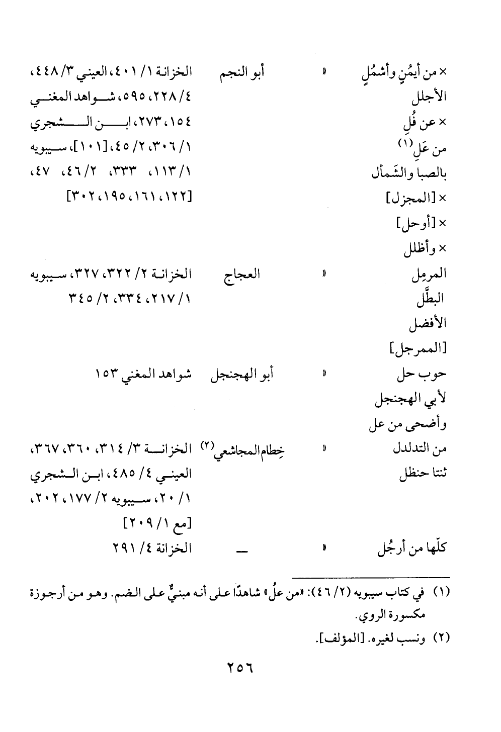 × من أيمُنٍ وأشمُلٍ الأجلل × عن فُلِ من عَلِ (¬١) بالصبا والشَمأل × [المجزل] × [أوحل] × وأظلل « أبو النجم الخزانة ١/ ٤٠١، العيني ٣/ ٤٤٨، ٤/ ٢٢٨، ٥٩٥، شواهد المغني ١٥٤، ٢٧٣، ابن الشجري ١/ ٣٠٦، ٢/ ٤٥، [١٠١]، سيبويه ١/ ١١٣، ٣٣٣، ٢/ ٤٦، ٤٧، [١٢٢، ١٦١، ١٩٥، ٣٠٢] المرمِلالبطَّل الأفضل [الممرجل] « العجاج الخزانة ٢/ ٣٢٢، ٣٢٧، سيبويه ١/ ٢١٧، ٣٣٤، ٢/ ٣٤٥ حوب حللأبي الهجنجل وأضحى من عل « أبو الهجنجل شواهد المغني ١٥٣ من التدلدل ثنتا حنظل « خِطام المجاشعي (¬٢) الخزانة ٣/ ٣١٤، ٣٦٠، ٣٦٧، العيني ٤/ ٤٨٥، ابن الشجري ١/ ٢٠، سيبويه ٢/ ١٧٧، ٢٠٢، [مع ١/ ٢٠٩] كلّها من أرجُل « ــ الخزانة ٤/ ٢٩١