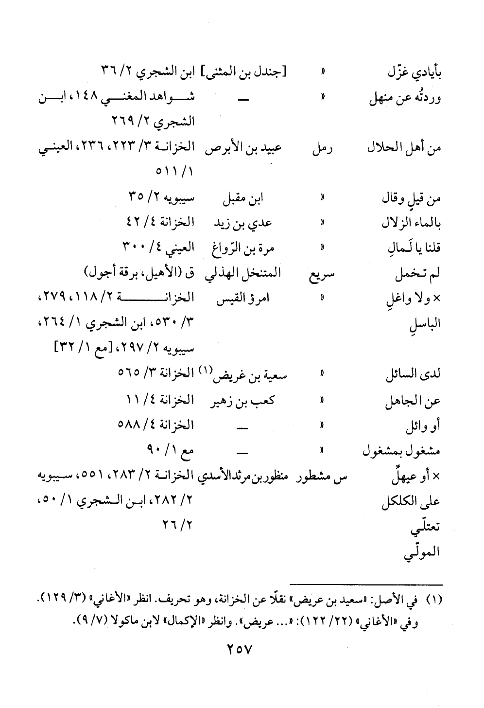 بأيادي غزّل « [جندل بن المثنى] ابن الشجري ٢/ ٣٦وردتُه عن منهل « ــ شواهد المغني ١٤٨، ابن الشجري ٢/ ٢٦٩من أهل الحلال رمل عبيد بن الأبرص الخزانة ٣/ ٢٢٣، ٢٣٦، العيني ١/ ٥١١من قيلٍ وقال « ابن مقبل سيبويه ٢/ ٣٥بالماء الزلال « عدي بن زيد الخزانة ٤/ ٤٢قلنا يا لَمالِ « مرة بن الرّواغ العيني ٤/ ٣٠٠لم تخمل سريع المتنخل الهذلي ق (الأهيل، برقة أجول)× ولا واغلِ الباسل « امرؤ القيس الخزانة ٢/ ١١٨، ٢٧٩، ٣/ ٥٣٠، ابن الشجري ١/ ٢٦٤، سيبويه ٢/ ٢٩٧، [مع ١/ ٣٢] لدى السائل « سعية بن غريض (¬١) الخزانة ٣/ ٥٦٥عن الجاهل « كعب بن زهير الخزانة ٤/ ١١أو وائل « ــ الخزانة ٤/ ٥٨٨مشغول بمشغول « ــ مع ١/ ٩٠× أو عيهلِّ على الكلكل تعتلّي المولّي س مشطور منظور بن مرثد الأسدي الخزانة ٢/ ٢٨٣، ٥٥١، سيبويه ٢/ ٢٨٢، ابن الشجري ١/ ٥٠، ٢/ ٢٦