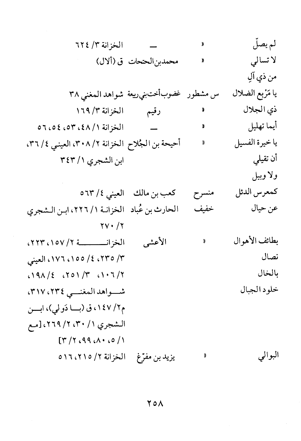 لم يصلّ « ــ الخزانة ٣/ ٦٢٤لا تسالي من ذي آل « محمد بن الحتحات ق (ألال)يا مَرْبع الضلال س مشطور غضوب أخت بني ربيعة شواهد المغني ٣٨ذي الجلال « رقيم الخزانة ٣/ ١٦٩أيما تهليل « ــ الخزانة ١/ ٤٨، ٥٣، ٥٤، ٥٦يا خيرة الفسيل أن تقيلي ولا وبيل « أحيحة بن الجُلاح الخزانة ٢/ ٣٠٨، العيني ٤/ ٣٦، ابن الشجري ١/ ٣٤٣ كمعرس الدئل منسرح كعب بن مالك العيني ٤/ ٥٦٣عن حيال خفيف الحارث بن عُباد الخزانة ١/ ٢٢٦، ابن الشجري ٢/ ٢٧٠بطائف الأهوال نصال بالخال خلود الجبال « الأعشى الخزانة ٢/ ١٥٧، ٢٢٣، ٣/ ٢٣٥، ٤/ ١٥٥، ١٧٦، العيني ٢/ ١٠٦، ٣/ ٢٥١، ٤/ ١٩٨، شواهد المغني ٢٣٤، ٣١٧، م ٢/ ١٤٧، ق (با دَولي)، ابن الشجري ١/ ٣٠، ٢/ ٢٦٩، [مع ١/ ٥، ٨٠، ٩٩، ٢/ ٣] البوالي « يزيد بن مفرّغ الخزانة ٢/ ٢١٥، ٥١٦