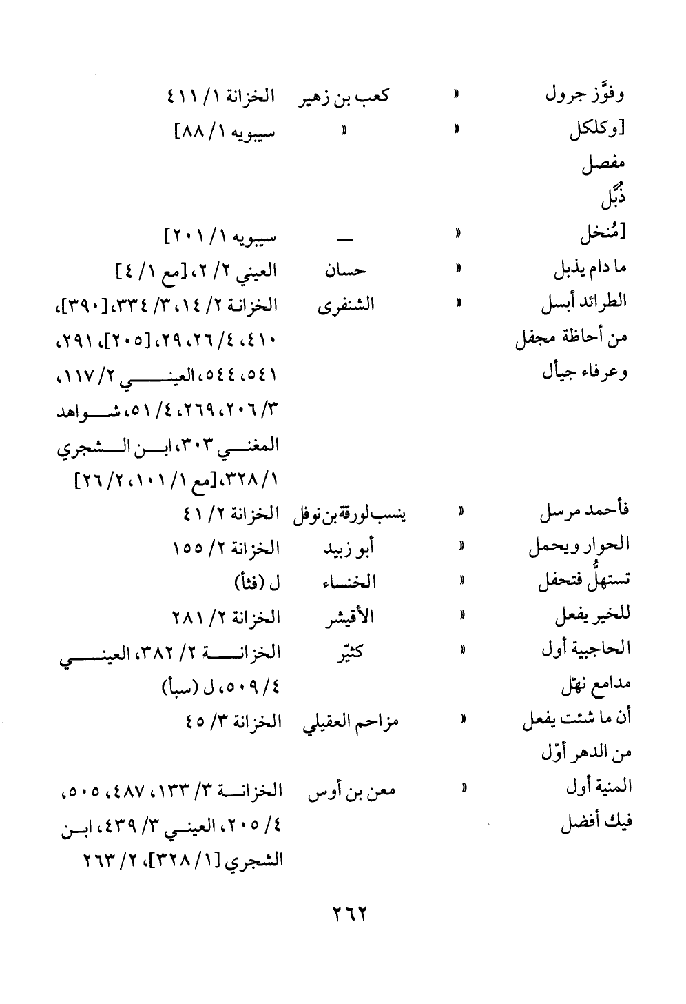 وفوَّز جرول « كعب بن زهير الخزانة ١/ ٤١١[وكلكل مفصل ذُبَّل « « سيبويه ١/ ٨٨] [مُنخل « ــ سيبويه ١/ ٢٠١]ما دام يذبل « حسان العيني ٢/ ٢، [مع ١/ ٤]الطرائد أبسلمن أحاظة مجفل وعرفاء جيأل « الشنفرى الخزانة ٢/ ١٤، ٣/ ٣٣٤، [٣٩٠]، ٤١٠، ٤/ ٢٦، ٢٩، [٢٠٥]، ٢٩١، ٥٤١، ٥٤٤، العيني ٢/ ١١٧، ٣/ ٢٠٦، ٢٦٩، ٤/ ٥١، شواهد المغني ٣٠٣، ابن الشجري ١/ ٣٢٨، [مع ١/ ١٠١، ٢/ ٢٦] فأحمد مرسل « ينسب لورقة بن نوفل الخزانة ٢/ ٤١الحوار ويحمل « أبو زبيد الخزانة ٢/ ١٥٥تستهلُّ فتحفل « الخنساء ل (فثأ)للخير يفعل « الأقيشر الخزانة ٢/ ٢٨١الحاجبية أول مدامع نهّل « كثيّر الخزانة ٢/ ٣٨٢، العيني ٤/ ٥٠٩، ل (سبأ) أن ما شئت يفعل من الدهر أوّل « مزاحم العقيلي الخزانة ٣/ ٤٥ المنية أول فيك أفضل « معن بن أوس الخزانة ٣/ ١٣٣، ٤٨٧، ٥٠٥، ٤/ ٢٠٥، العيني ٣/ ٤٣٩، ابن الشجري [١/ ٣٢٨]، ٢/ ٢٦٣