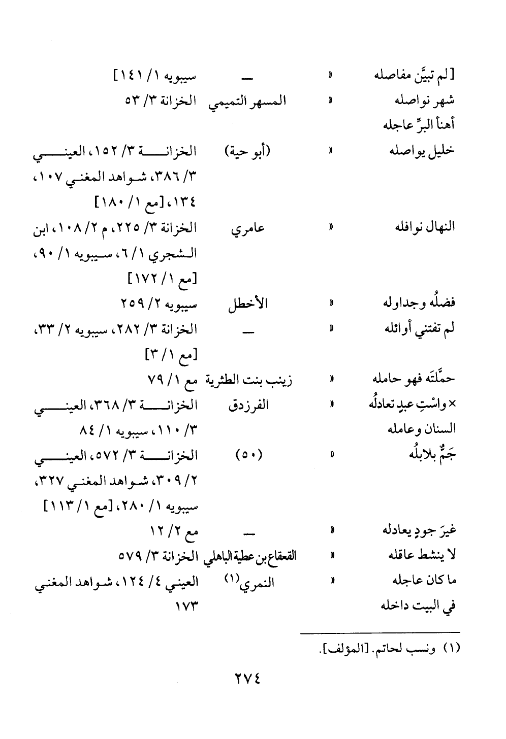 [لم تبيَّن مفاصله « ــ سيبويه ١/ ١٤١]شهر نواصله أهنأ البرِّ عاجله « المسهر التميمي الخزانة ٣/ ٥٣ خليل يواصله « (أبو حية) الخزانة ٣/ ١٥٢، العيني ٣/ ٣٨٦، شواهد المغني ١٠٧، ١٣٤، [مع ١/ ١٨٠]النهال نوافله « عامري الخزانة ٣/ ٢٢٥، م ٢/ ١٠٨، ابن الشجري ١/ ٦، سيبويه ١/ ٩٠، [مع ١/ ١٧٢]فضلُه وجداوله « الأخطل سيبويه ٢/ ٢٥٩لم تفتني أوائله « ــ الخزانة ٣/ ٢٨٢، سيبويه ٢/ ٣٣، [مع ١/ ٣]حمَّلتَه فهو حامله « زينب بنت الطثرية مع ١/ ٧٩× واسْتِ عبدٍ تعادلُه السنان وعامله « الفرزدق الخزانة ٣/ ٣٦٨، العيني ٣/ ١١٠، سيبويه ١/ ٨٤ جَمٌّ بلابلُه « (٥٠) الخزانة ٣/ ٥٧٢، العيني ٢/ ٣٠٩، شواهد المغني ٣٢٧، سيبويه ١/ ٢٨٠، [مع ١/ ١١٣]غيرَ جودٍ يعادله « ــ مع ٢/ ١٢لا ينشط عاقله « القعقاع بن عطية الباهلي الخزانة ٣/ ٥٧٩ما كان عاجلهفي البيت داخله « النمري (¬١) العيني ٤/ ١٢٤، شواهد المغني ١٧٣