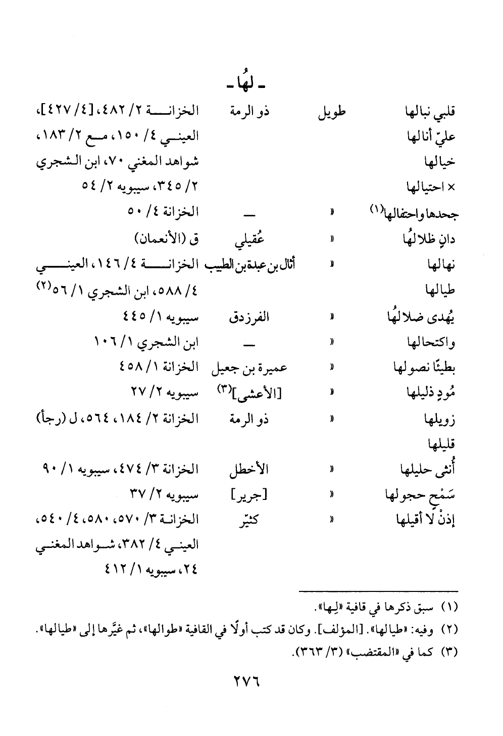 قلبي نبالها عليّ أنالها خيالها × احتيالها طويل ذو الرمة الخزانة ٢/ ٤٨٢، [٤/ ٤٢٧]، العيني ٤/ ١٥٠، مع ٢/ ١٨٣، شواهد المغني ٧٠، ابن الشجري ٢/ ٣٤٥، سيبويه ٢/ ٥٤ جحدها واحتفالها (¬١) « ــ الخزانة ٤/ ٥٠دانٍ ظلالُها « عُقيلي ق (الأنعمان)نهالها طيالها « أثال بن عبدة بن الطبيب الخزانة ٤/ ١٤٦، العيني ٤/ ٥٨٨، ابن الشجري ١/ ٥٦ (¬٢)يُهدى ضلالُها « الفرزدق سيبويه ١/ ٤٤٥واكتحالها « ــ ابن الشجري ١/ ١٠٦بطيئًا نصولها « عميرة بن جعيل الخزانة ١/ ٤٥٨مُودٍ ذليلها « [الأعشى] (¬٣) سيبويه ٢/ ٢٧زويلها قليلها « ذو الرمة الخزانة ٢/ ١٨٤، ٥٦٤، ل (رجأ) أُنثى حليلها « الأخطل الخزانة ٣/ ٤٧٤، سيبويه ١/ ٩٠سَمْحٍ حجولها « [جرير] سيبويه ٢/ ٣٧إذنْ لا أقيلها « كثيّر الخزانة ٣/ ٥٧٠، ٥٨٠، ٤/ ٥٤٠، العيني ٤/ ٣٨٢، شواهد المغني ٢٤، سيبويه ١/ ٤١٢