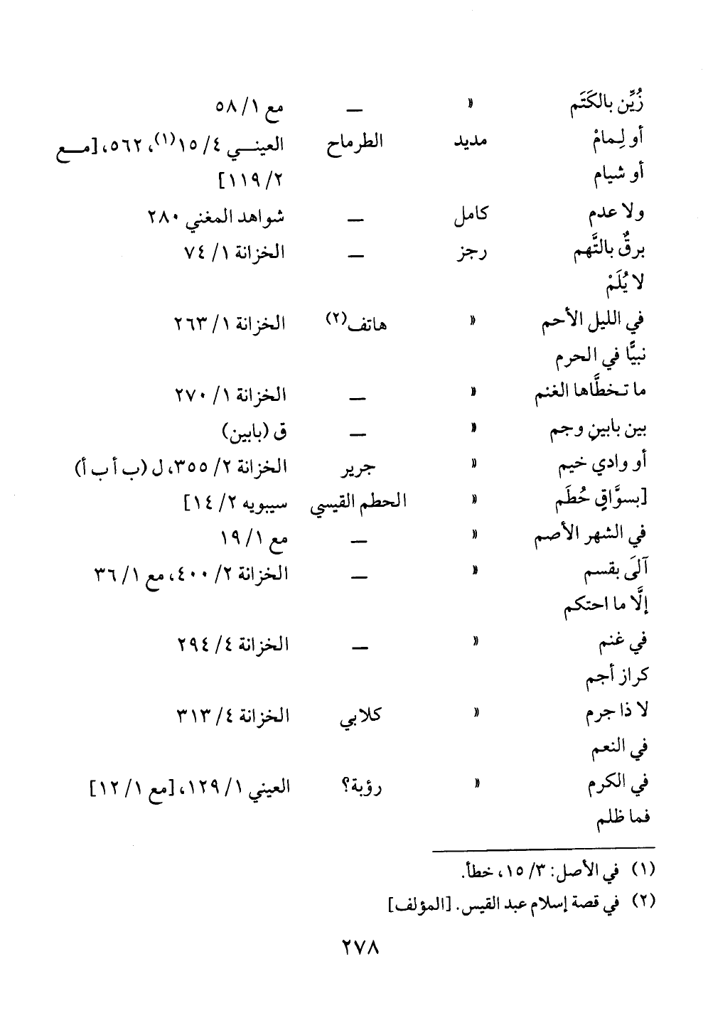 زُيِّن بالكَتَم « ــ مع ١/ ٥٨أو لِمامْأو شيام مديد الطرماح العيني ٤/ ١٥ (¬١)، ٥٦٢، [مع ٢/ ١١٩] ولا عدم كامل ــ شواهد المغني ٢٨٠برقٌ بالتَّهم لا يُلَمْ رجز ــ الخزانة ١/ ٧٤ في الليل الأحمنبيًّا في الحرم « هاتف (¬٢) الخزانة ١/ ٢٦٣ ما تخطَّاها الغنم « ــ الخزانة ١/ ٢٧٠بين بابينِ وجم « ــ ق (بابين)أو وادي خيم « جرير الخزانة ٢/ ٣٥٥، ل (ب أب أ)[بسوَّاقٍ حُطَم « الحطم القيسي سيبويه ٢/ ١٤]في الشهر الأصم « ــ مع ١/ ١٩آلَى بقسم إلَّا ما احتكم « ــ الخزانة ٢/ ٤٠٠، مع ١/ ٣٦ في غنمكراز أجم « ــ الخزانة ٤/ ٢٩٤ لا ذا جرم في النعم « كلابي الخزانة ٤/ ٣١٣ في الكرمفما ظلم « رؤبة؟ العيني ١/ ١٢٩، [مع ١/ ١٢]
