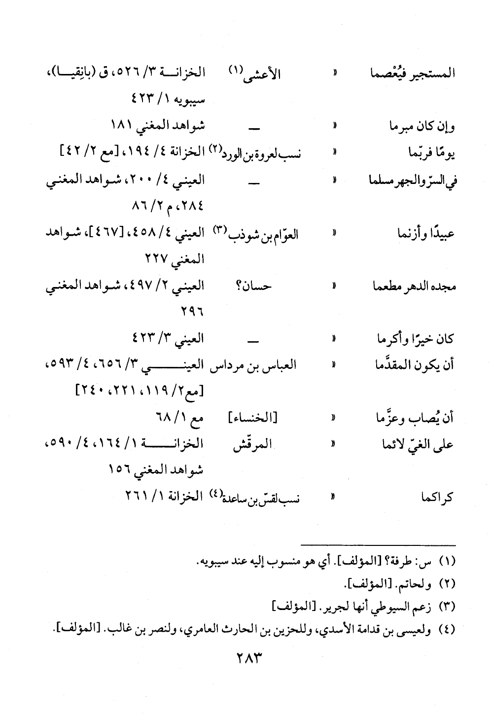 المستجير فيُعْصما « الأعشى (¬١) الخزانة ٣/ ٥٢٦، ق (بانِقيا)، سيبويه ١/ ٤٢٣وإن كان مبرما « ــ شواهد المغني ١٨١يومًا فربّما « نسب لعروة بن الورد (¬٢) الخزانة ٤/ ١٩٤، [مع ٢/ ٤٢]في السرّ والجهر مسلما « ــ العيني ٤/ ٢٠٠، شواهد المغني ٢٨٤، م ٢/ ٨٦عبيدًا وأزنما « العوّام بن شوذب (¬٣) العيني ٤/ ٤٥٨، [٤٦٧]، شواهد المغني ٢٢٧مجده الدهر مطعما « حسان؟ العيني ٢/ ٤٩٧، شواهد المغني ٢٩٦كان خيرًا وأكرما « ــ العيني ٣/ ٤٢٣أن يكون المقدَّما « العباس بن مرداس العيني ٣/ ٦٥٦، ٤/ ٥٩٣، [مع ٢/ ١١٩، ٢٢١، ٢٤٠]أن يُصاب وعزَّما « [الخنساء] مع ١/ ٦٨على الغيّ لائما « المرقّش الخزانة ١/ ١٦٤، ٤/ ٥٩٠، شواهد المغني ١٥٦كراكما « نسب لقسّ بن ساعدة (¬٤) الخزانة ١/ ٢٦١