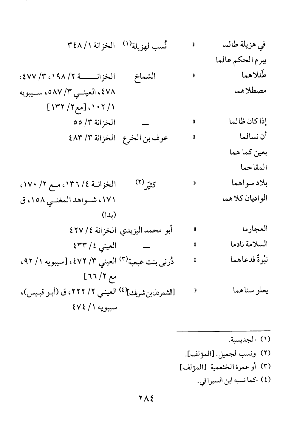 في هزيلة طالما يبرم الحكم عالما « نُسب لهزيلة (¬١) الخزانة ١/ ٣٤٨طَللاهما مصطلاهما « الشماخ الخزانة ٢/ ١٩٨، ٣/ ٤٧٧، ٤٧٨، العيني ٣/ ٥٨٧، سيبويه ١/ ١٠٢، [مع ٢/ ١٣٢] إذا كان ظالما « ــ الخزانة ٣/ ٥٥أن نسالما بعين كما هما المقاحما « عوف بن الخرع الخزانة ٣/ ٤٨٣ بلاد سواهماالواديان كلاهما « كثيّر (¬٢) الخزانة ٤/ ١٣٦، مع ٢/ ١٧٠، ١٧١، شواهد المغني ١٥٨، ق (بدا) العجارما « أبو محمد اليزيدي الخزانة ٤/ ٤٢٧السلامة نادما « ــ العيني ٤/ ٤٣٣نبْوةً فدعاهما « دُرنى بنت عبعبة (¬٣) العيني ٣/ ٤٧٢، [سيبويه ١/ ٩٢، مع ٢/ ٦٦]يعلو سناهما « [الشمردل بن شريك] (¬٤) العيني ٢/ ٢٢٢، ق (أبو قبيس)، سيبويه ١/ ٤٧٤