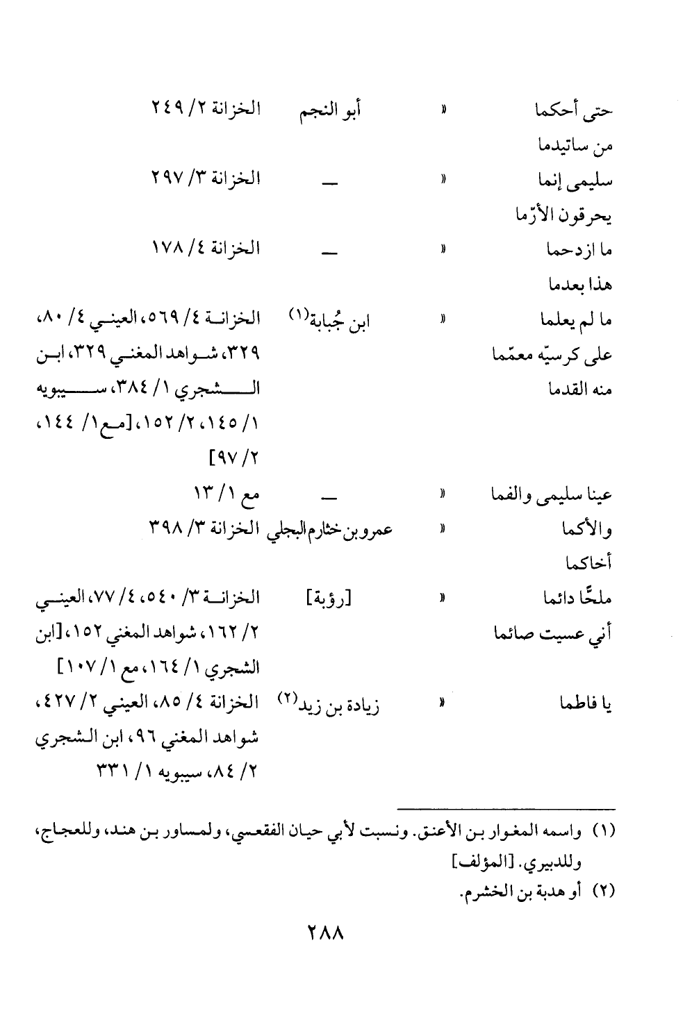 حتى أحكما من ساتيدما « أبو النجم الخزانة ٢/ ٢٤٩ سليمى إنما يحرقون الأرّما « ــ الخزانة ٣/ ٢٩٧ ما ازدحما هذا بعدما « ــ الخزانة ٤/ ١٧٨ما لم يعلما على كرسيّه معمّما منه القدما « ابن جُبابة (¬١) الخزانة ٤/ ٥٦٩، العيني ٤/ ٨٠، ٣٢٩، شواهد المغني ٣٢٩، ابن الشجري ١/ ٣٨٤، سيبويه ١/ ١٤٥، ٢/ ١٥٢، [مع ١/ ١٤٤، ٢/ ٩٧] عينا سليمى والفما « ــ مع ١/ ١٣والأكم أخاكماا « عمرو بن خثارم البجلي الخزانة ٣/ ٣٩٨ملحًّا دائماأني عسيت صائما « [رؤبة] الخزانة ٣/ ٥٤٠، ٤/ ٧٧، العيني ٢/ ١٦٢، شواهد المغني ١٥٢، [ابن الشجري ١/ ١٦٤، مع ١/ ١٠٧] يا فاطما « زيادة بن زيد (¬٢) الخزانة ٤/ ٨٥، العيني ٢/ ٤٢٧، شواهد المغني ٩٦، ابن الشجري ٢/ ٨٤، سيبويه ١/ ٣٣١