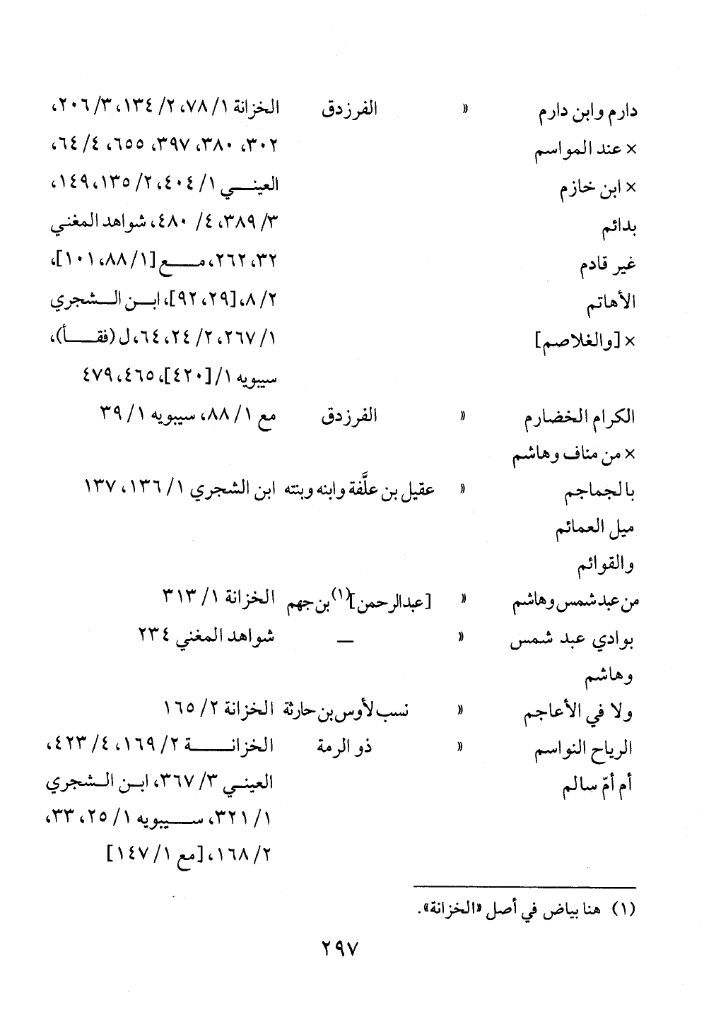 دارم وابن دارم × عند المواسم × ابن خازم بدائم غير قادم الأهاتم × [والغلاصم] « الفرزدق الخزانة ١/ ٧٨، ٢/ ١٣٤، ٣/ ٢٠٦، ٣٠٢، ٣٨٠، ٣٩٧، ٦٥٥، ٤/ ٦٤، العيني ١/ ٤٠٤، ٢/ ١٣٥، ١٤٩، ٣/ ٣٨٩، ٤/ ٤٨٠، شواهد المغني ٣٢، ٢٦٢، مع [١/ ٨٨، ١٠١]، ٢/ ٨، [٢٩، ٩٢]، ابن الشجري ١/ ٢٦٧، ٢/ ٢٤، ٦٤، ل (فقأ)، سيبويه ١/ [٤٢٠]، ٤٦٥، ٤٧٩ الكرام الخضارم × من مناف وهاشم « الفرزدق مع ١/ ٨٨، سيبويه ١/ ٣٩ بالجماجمميل العمائم والقوائم « عقيل بن علَّفة وابنه وبنته ابن الشجري ١/ ١٣٦، ١٣٧ من عبد شمس وهاشم « [عبد الرحمن] (¬١) بن جهم الخزانة ١/ ٣١٣بوادي عبد شمس وهاشم « ــ شواهد المغني ٢٣٤ولا في الأعاجم « نسب لأوس بن حارثة الخزانة ٢/ ١٦٥الرياح النواسم أم أمّ سالم « ذو الرمة الخزانة ٢/ ١٦٩، ٤/ ٤٢٣، العيني ٣/ ٣٦٧، ابن الشجري ١/ ٣٢١، سيبويه ١/ ٢٥، ٣٣، ٢/ ١٦٨، [مع ١/ ١٤٧]