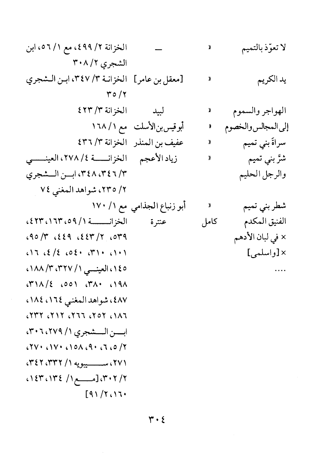 لا تعوّذ بالتميم « ــ الخزانة ٢/ ٤٩٩، مع ١/ ٥٦، ابن الشجري ٢/ ٣٠٨يد الكريم « [معقل بن عامر] الخزانة ٣/ ٣٤٧، ابن الشجري ٢/ ٣٥الهواجر والسموم « لبيد الخزانة ٣/ ٤٢٣إلى المجالس والخصوم « أبو قيس بن الأسلت مع ١/ ١٦٨سراةَ بني تميم « عفيف بن المنذر الخزانة ٣/ ٤٣٦شرَّ بني تميم والرجل الحليم « زياد الأعجم الخزانة ٤/ ٢٧٨، العيني ٣/ ٣٤٦، ٣٤٨، ابن الشجري ٢/ ٢٣٥، شواهد المغني ٧٤ شطر بني تميم « أبو زنباع الجذامي مع ١/ ١٧٠الفنيق المكدم × في لبان الأدهم × [واسلمى] *** كامل عنترة الخزانة ١/ ٥٩، ١٦٣، ٤٢٣، ٥٣٩، ٢/ ٤٤٣، ٤٤٩، ٣/ ٩٥، ١٠١، ٣١٠، ٥٤٠، ٤/ ٤، ١٦، ١٤٥، العيني ١/ ٣٢٧، ٣/ ١٨٨، ١٩٨، ٣٨٠، ٥٥١، ٤/ ٣١٨، ٤٨٧، شواهد المغني ١٦٤، ١٨٤، ١٨٦، ٢٥٢، ٢٦٦، ٢١٢، ٢٣٢، ابن الشجري ١/ ٢٧٩، ٣٠٦، ٢/ ٥، ٦، ٩٠، ١٥٨، ١٧٠، ٢٧٠، ٢٧١، سيبويه ١/ ٣٣٢، ٣٤٢، ٢/ ٣٠٢، [مع ١/ ١٣٤، ١٤٣، ١٦٠، ٢/ ٩١]