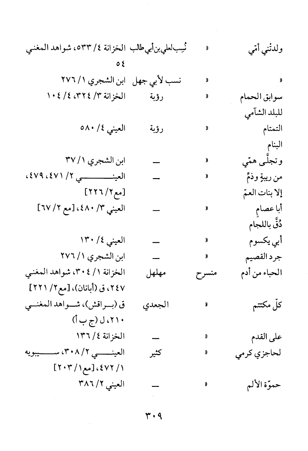 ولدتْني أمّي « نُسِب لعلي بن أبي طالب الخزانة ٤/ ٥٣٣، شواهد المغني ٥٤« « نسب لأبي جهل ابن الشجري ١/ ٢٧٦سوابق الحمام للبلد الشآمي « رؤبة الخزانة ٣/ ٣٢٤، ٤/ ١٠٤ التمتام البنام « رؤبة العيني ٤/ ٥٨٠ وتجلَّى همّي « ــ ابن الشجري ١/ ٣٧من ريبةٍ وذمِّإلا بنات العمّ « ــ العيني ٢/ ٤٧١، ٤٧٩، [مع ٢/ ٢٢٦] أبا عصامِ دُقَّ باللجام « ــ العيني ٣/ ٤٨٠، [مع ٢/ ٦٧] أبي يكسوم « ــ العيني ٤/ ١٣٠جرد القصيم « ــ ابن الشجري ١/ ٢٧٦الحباء من أدم منسرح مهلهل الخزانة ١/ ٣٠٤، شواهد المغني ٢٤٧، ق (أبانان)، [مع ٢/ ٢٢١]كلّ مكتتم « الجعدي ق (براقش)، شواهد المغني ٢١٠، ل (ج ب أ)على القدم « ــ الخزانة ٤/ ١٣٦لحاجزي كرمي « كثير العيني ٢/ ٣٠٨، سيبويه ١/ ٤٧٢، [مع ١/ ٢٠٣]حموّة الألم « ــ العيني ٢/ ٣٨٦