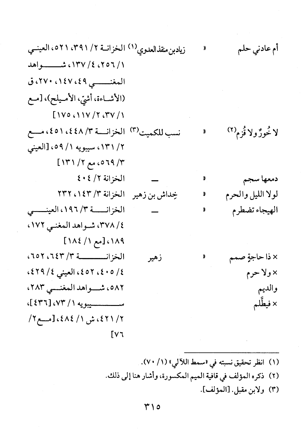 أم عادني حلم « زياد بن منقذ العدوي (¬١) الخزانة ٢/ ٣٩١، ٥٢١، العيني ١/ ٢٥٦، ٤/ ١٣٧، شواهد المغني ٤٩، ١٤٧، ٢٧٠، ق (الأشاءة، أشيّ، الأميلح)، [مع ١/ ٣٧، ٢/ ١١٧، ١٧٥]لا خُورٌ ولا قُزم (¬٢) « نسب للكميت (¬٣) الخزانة ٣/ ٤٤٨، ٤٥١، مع ٢/ ١٣١، سيبويه ١/ ٥٩، [العيني ٣/ ٥٦٩، مع ٢/ ١٣١]دمعها سجم « ــ الخزانة ٢/ ٤٠٤لولا الليل والحرم « خِداش بن زهير الخزانة ٣/ ١٤٣، ٢٣٢الهيجاء تضطرم « ــ الخزانة ٣/ ١٩٦، العيني ٤/ ٣٧٨، شواهد المغني ١٧٢، ١٨٩، [مع ١/ ١٨٤] × ذا حاجةٍ صمم × ولا حرم والديم × فيطَّلم « زهير الخزانة ٣/ ٦٤٣، ٦٥٢، ٤/ ٤٠٥، ٤٥٢، العيني ٤/ ٤٢٩، ٥٨٢، شواهد المغني ٢٨٣، سيبويه ١/ ٧٣، [٤٣٦]، ٢/ ٤٢١، ش ١/ ٤٨٤، [مع ٢/ ٧٦]