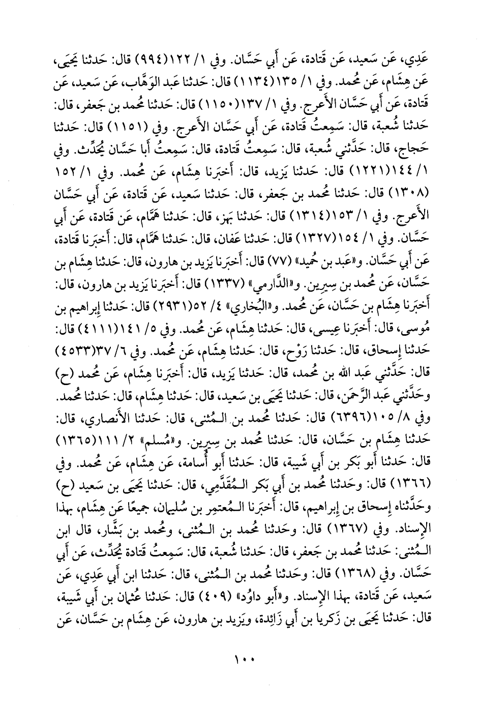 وفي ١/ ١٣٧ (١١٥٠) قال: حدثنا محمد بن جعفر، قال: حدثنا شعبة، قال: سمعت قتادة، عن أبي حسان الأعرج. وفي (١١٥١) قال: حدثنا حجاج، قال: حدثني شعبة، قال: سمعت قتادة، قال: سمعت أبا حسان يحدث. وفي ١/ ١٤٤ (١٢٢١) قال: حدثنا يزيد، قال: أخبرنا هشام، عن محمد. وفي ١/ ١٥٢ (١٣٠٨) قال: حدثنا محمد بن جعفر، قال: حدثنا سعيد، عن قتادة، عن أبي حسان الأعرج. وفي ١/ ١٥٣ (١٣١٤) قال: حدثنا بَهز، قال: حدثنا همام، عن قتادة، عن أبي حسان. وفي ١/ ١٥٤ (١٣٢٧) قال: حدثنا عفان، قال: حدثنا همام، قال: أخبرنا قتادة، عن أبي حسان. و «عَبد بن حُميد» (٧٧) قال: أخبرنا يزيد بن هارون، قال: حدثنا هشام بن حسان، عن محمد بن سِيرين. و «الدَّارِمي» (١٣٣٧) قال: أخبرنا يزيد بن هارون، قال: أخبرنا هشام بن حسان، عن محمد. و «البخاري» ٤/ ٤٣ (٢٩٣١) قال: حدثنا إبراهيم بن موسى، قال: أخبرنا عيسى، قال: حدثنا هشام، عن محمد. وفي ٥/ ١١٠ (٤١١١) قال: حدثنا إسحاق، قال: حدثنا روح، قال: حدثنا هشام، عن محمد. وفي ٦/ ٣٠ (٤٥٣٣) قال: حدثني عبد الله بن محمد، قال: حدثنا يزيد، قال: أخبرنا هشام، عن محمد (ح) وحدثني عبد الرَّحمَن، قال: حدثنا يحيى بن سعيد، قال: حدثنا هشام, قال: حدثنا محمد. وفي ٨/ ٨٤ (٦٣٩٦) قال: حدثنا محمد بن المثنى، قال: حدثنا الأَنصاري، قال: حدثنا هشام بن حسان، قال: حدثنا محمد بن سِيرين. و «مسلم» ٢/ ١١١ (١٣٦٥) قال: حدثنا أَبو بكر بن أبي شيبة، قال: حدثنا أَبو أُسامة، عن هشام، عن محمد. وفي (١٣٦٦) قال: وحدثنا محمد بن أَبي بكر المُقَدَّمي، قال: حدثنا يحيى بن سعيد (ح) وحدثناه إسحاق بن إبراهيم، قال: أخبرنا المُعتَمِر بن سليمان، جميعا عن هشام، بهذا الإسناد. وفي (١٣٦٧) قال: وحدثنا محمد بن المثنى، ومحمد بن بشار، قال ابن المثنى: حدثنا محمد بن جعفر، قال: حدثنا شعبة، قال: سمعت قتادة يحدث، عن أبي حسان. وفي (١٣٦٨) قال: وحدثنا محمد بن المثنى، قال: حدثنا ابن أَبي عَدي، عن سعيد، عن قتادة، بهذا الإسناد. و «أَبو داود» (٤٠٩) قال: حدثنا عثمان بن أبي شيبة، قال: حدثنا يحيى بن زكريا بن أبي زائدة، ويزيد بن هارون، عن هشام بن حسان، عن