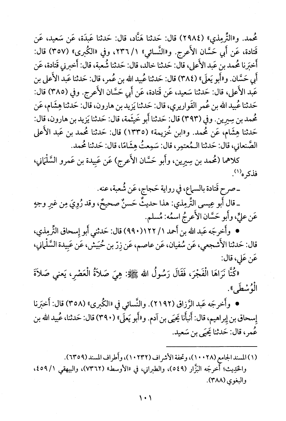 و «التِّرمِذي» (٢٩٨٤) قال: حدثنا هَنَّاد، قال: حدثنا عبدة، عن سعيد، عن قتادة، عن أبي حسان الأعرج. و «النَّسَائي» ١/ ٢٣٦، وفي «الكبرى» (٣٥٧) قال: أخبرنا محمد بن عبد الأعلى، قال: حدثنا خالد، قال: حدثنا شعبة، قال: أخبرني قتادة، عن أبي حسان. و «أَبو يَعلى» (٣٨٤) قال: حدثنا عُبيد الله بن عمر، قال: حدثنا عبد الأعلى بن عبد الأعلى، قال: حدثنا سعيد، عن قتادة، عن أبي حسان الأعرج. وفي (٣٨٥) قال: حدثنا عُبيد الله بن عمر القواريري، قال: حدثنا يزيد بن هارون، قال: حدثنا هشام، عن محمد بن سِيرين. وفي (٣٩٣) قال: حدثنا أَبو خيثمة، قال: حدثنا يزيد بن هارون، قال: حدثنا هشام، عن محمد. و «ابن خزيمة» (١٣٣٥) قال: حدثنا محمد بن عبد الأعلى الصَّنْعاني، قال: حدثنا المُعتَمِر، قال: سمعت هشاما، قال: حدثنا محمد.