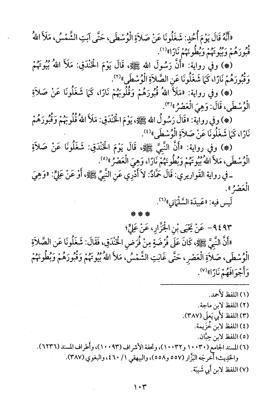 - وفي رواية: «عن النبي صَلى الله عَليه وسَلم؛ أنه كان يوم الأحزاب، على فرضة من فراض الخندق، فقال: شغلونا عن صلاة الوسطى، حتى غربت الشمس، ملأ الله قبورهم وبيوتهم، أو بطونهم وبيوتهم، نارا» (¬٣).