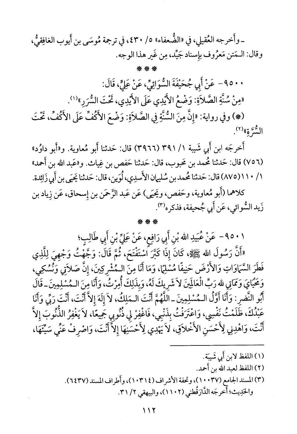 «أن رسول الله صَلى الله عَليه وسَلم كان إذا كبر استفتح، ثم قال: وجهت وجهي للذي فطر السماوات والأرض حنيفا مسلما، وما أنا من المشركين، إن صلاتي ونسكي، ومحياي ومماتي لله رب العالمين لا شريك له، وبذلك أمرت، وأنا من المسلمين ـ قال أَبو النضر: وأنا أول المسلمين ـ اللهم أنت الملك، لا إله إلا أنت، أنت ربي وأنا عبدك، ظلمت نفسي، واعترفت بذنبي، فاغفر لي ذنوبي جميعا، لا يغفر الذنوب إلا أنت، واهدني لأحسن الأخلاق، لا يهدي لأحسنها إلا أنت، واصرف عني سيئها،