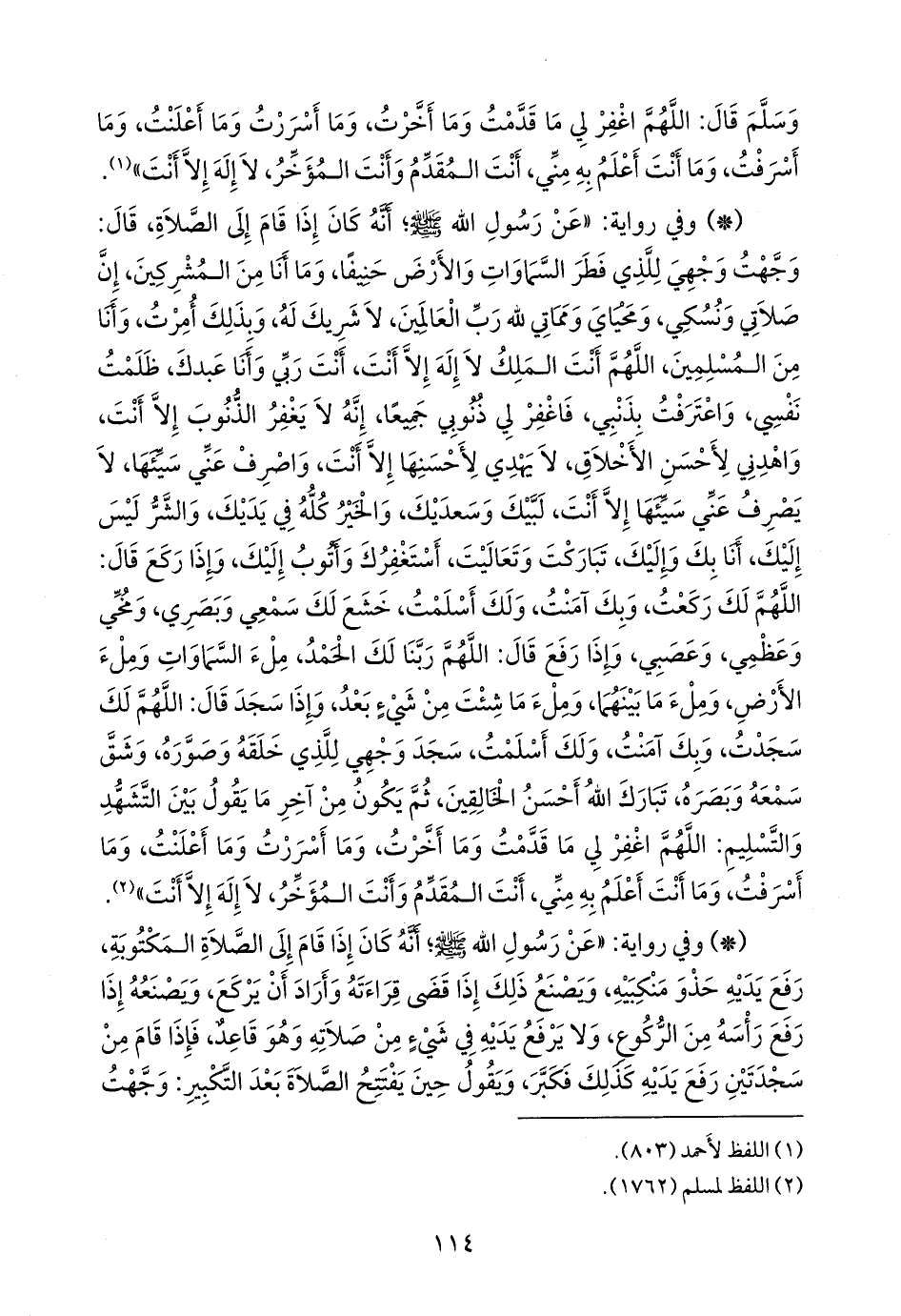 - وفي رواية: «عن رسول الله صَلى الله عَليه وسَلم؛ أنه كان إذا قام إلى الصلاة، قال: وجهت وجهي للذي فطر السماوات والأرض حنيفا، وما أنا من المشركين، إن صلاتي ونسكي، ومحياي ومماتي لله رب العالمين، لا شريك له، وبذلك أمرت، وأنا من المسلمين، اللهم أنت الملك لا إله إلا أنت، أنت ربي وأنا عبدك، ظلمت نفسي، واعترفت بذنبي، فاغفر لي ذنوبي جميعا، إنه لا يغفر الذنوب إلا أنت، واهدني لأحسن الأخلاق، لا يهدي لأحسنها إلا أنت، واصرف عني سيئها، لا يصرف عني سيئها إلا أنت، لبيك وسعديك، والخير كله في يديك، والشر ليس إليك، أنا بك وإليك، تباركت وتعاليت، أستغفرك وأتوب إليك، وإذا ركع قال: اللهم لك ركعت، وبك آمنت، ولك أسلمت، خشع لك سمعي وبصري، ومخي وعظمي، وعصبي، وإذا رفع قال: اللهم ربنا لك الحمد، ملء السماوات وملء الأرض، وملء ما بينهما، وملء ما شئت من شيء بعد، وإذا سجد قال: اللهم لك سجدت، وبك آمنت، ولك أسلمت، سجد وجهي للذي خلقه وصوره، وشق سمعه وبصره، تبارك الله أحسن الخالقين، ثم يكون من آخر ما يقول بين التشهد والتسليم: اللهم اغفر لي ما قدمت وما أخرت، وما أسررت وما أعلنت، وما أسرفت، وما أنت أعلم به مني، أنت المقدم وأنت المؤخر، لا إله إلا أنت» (¬١).