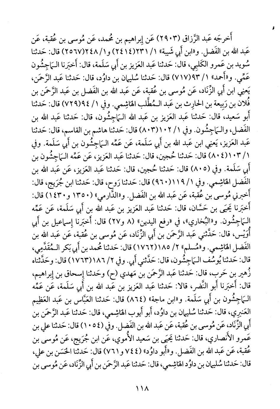 وفي ٢/ ١٨٦ (١٧٦٣) قال: وحدثناه زهير بن حرب، قال: حدثنا عبد الرَّحمَن بن مهدي (ح) وحدثنا إسحاق بن إبراهيم، قال: أخبرنا أَبو النضر، قالا: حدثنا عبد العزيز بن عبد الله بن أبي سلمة، عن عمه المَاجِشون بن أبي سلمة. و «ابن ماجة» (٨٦٤) قال: حدثنا العباس بن عبد العظيم العنبري، قال: حدثنا سليمان بن داود، أَبو أيوب الهاشمي، قال: حدثنا عبد الرَّحمَن بن أبي الزناد، عن موسى بن عُقبة، عن عبد الله بن الفضل. وفي (١٠٥٤) قال: حدثنا علي بن عَمرو الأَنصاري، قال: حدثنا يحيى بن سعيد الأُمَوي، عن ابن جُريج، عن موسى بن عُقبة، عن عبد الله بن الفضل. و «أَبو داود» (٧٤٤ و ٧٦١) قال: حدثنا الحسن بن علي، قال: حدثنا سليمان بن داود الهاشمي، قال: حدثنا عبد الرَّحمَن بن أبي الزناد، عن موسى بن