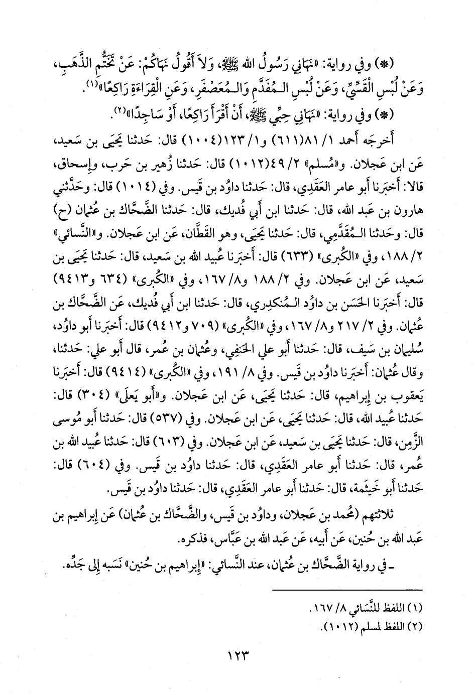 وفي ٢/ ٢١٧ و ٨/ ١٦٧، وفي «الكبرى» (٧٠٩ و ٩٤١٢) قال: أخبرنا أَبو داود سليمان بن سيف، قال: حدثنا أَبو علي الحنفي، وعثمان بن عمر، قال أَبو علي: حدثنا، وقال عثمان: أخبرنا داود بن قيس. وفي ٨/ ١٩١، وفي «الكبرى» (٩٤١٤) قال: أخبرنا يعقوب بن إبراهيم، قال: حدثنا يحيى، عن ابن عَجلان. و «أَبو يَعلى» (٣٠٤) قال: حدثنا عُبيد الله، قال: حدثنا يحيى، عن ابن عَجلان. وفي (٥٣٧) قال: حدثنا أَبو موسى الزمن، قال: حدثنا يحيى بن سعيد، عن ابن عَجلان. وفي (٦٠٣) قال: حدثنا عُبيد الله بن عمر، قال: حدثنا أَبو عامر العَقَدي، قال: حدثنا داود بن قيس. وفي (٦٠٤) قال: حدثنا أَبو خيثمة، قال: حدثنا أَبو عامر العَقَدي، قال: حدثنا داود بن قيس.