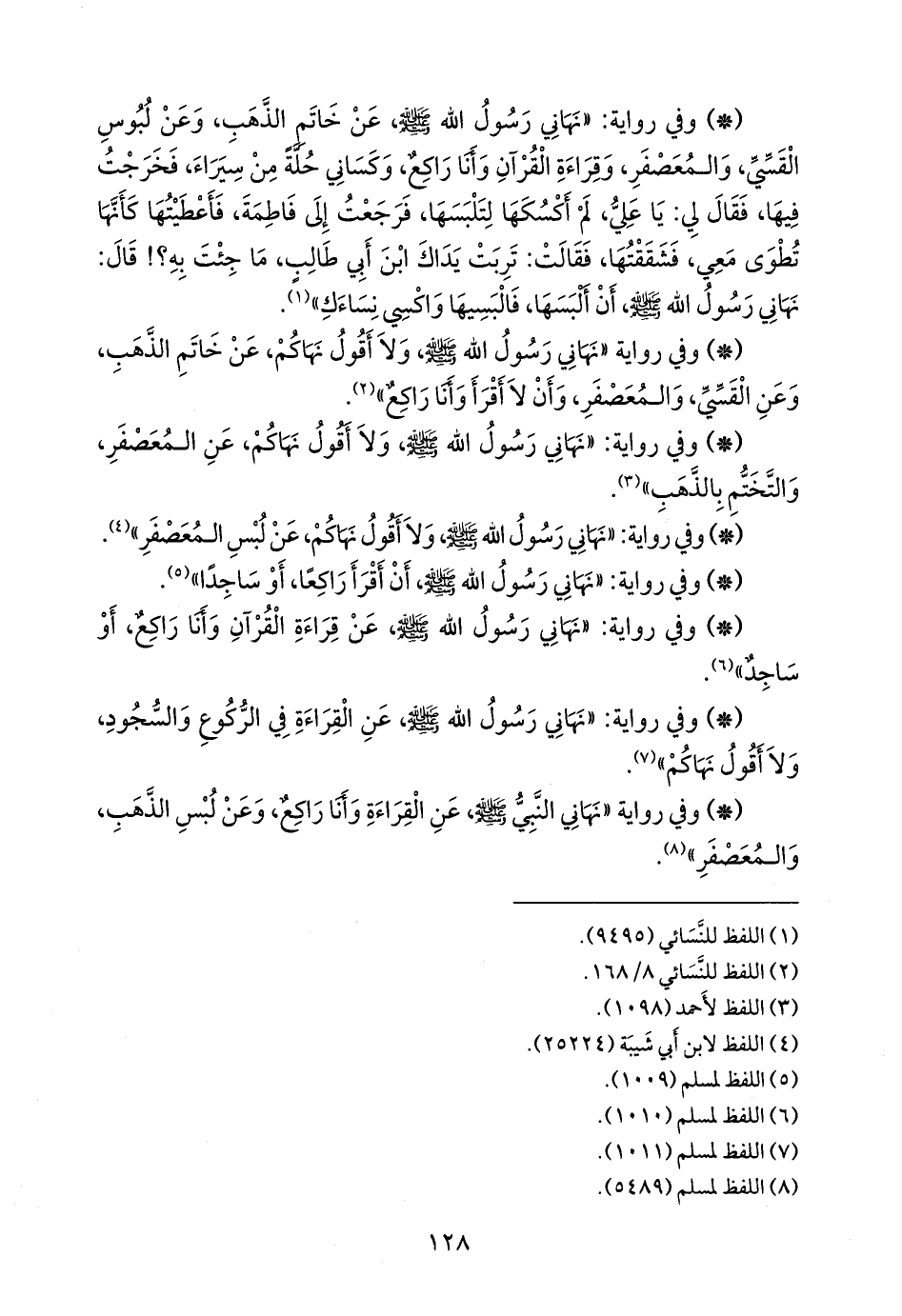 - وفي رواية: «نهاني رسول الله صَلى الله عَليه وسَلم ولا أقول نهاكم، عن خاتم الذهب، وعن القسي، والمعصفر، وأن لا أقرأ وأنا راكع» (¬٢).