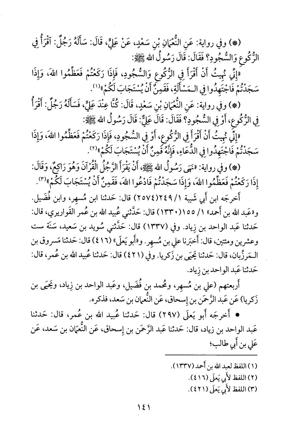 - وفي رواية: «نهى رسول الله صَلى الله عَليه وسَلم أن يقرأ الرجل القرآن وهو راكع، وقال: إذا ركعتم فعظموا الله، وإذا سجدتم فادعوا الله، فقمن أن يستجاب لكم» (¬١).