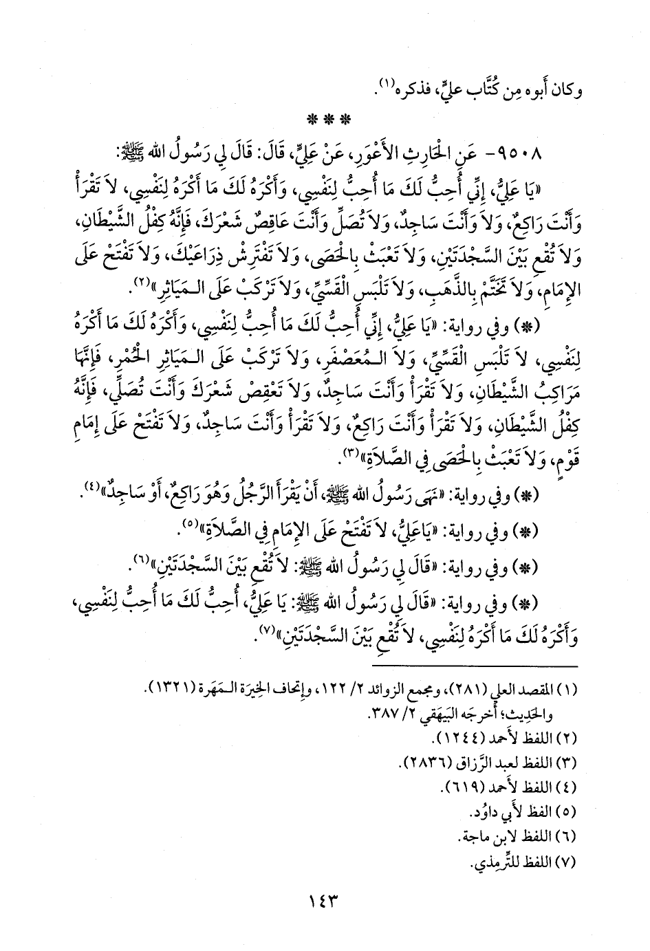 «يا علي، إني أحب لك ما أحب لنفسي، وأكره لك ما أكره لنفسي، لا تقرأ وأنت راكع، ولا وأنت ساجد، ولا تصل وأنت عاقص شعرك، فإنه كفل الشيطان، ولا تقع بين السجدتين، ولا تعبث بالحصى، ولا تفترش ذراعيك، ولا تفتح على الإمام، ولا تختم بالذهب، ولا تلبس القسي، ولا تركب على المياثر» (¬١).