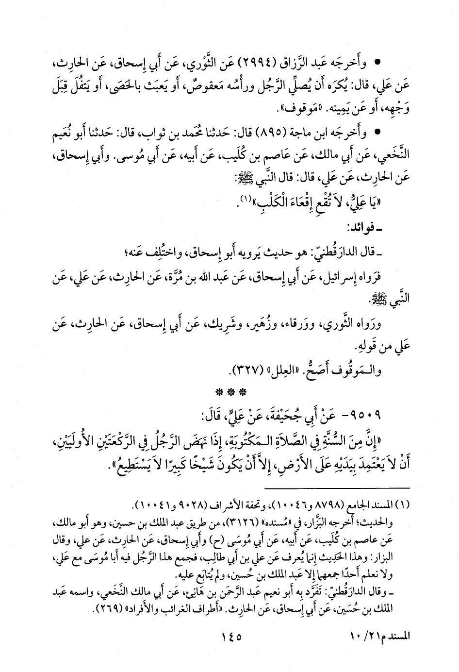 «إن من السنة في الصلاة المكتوبة، إذا نهض الرجل في الركعتين الأوليين، أن لا يعتمد بيديه على الأرض، إلا أن يكون شيخا كبيرا لا يستطيع».