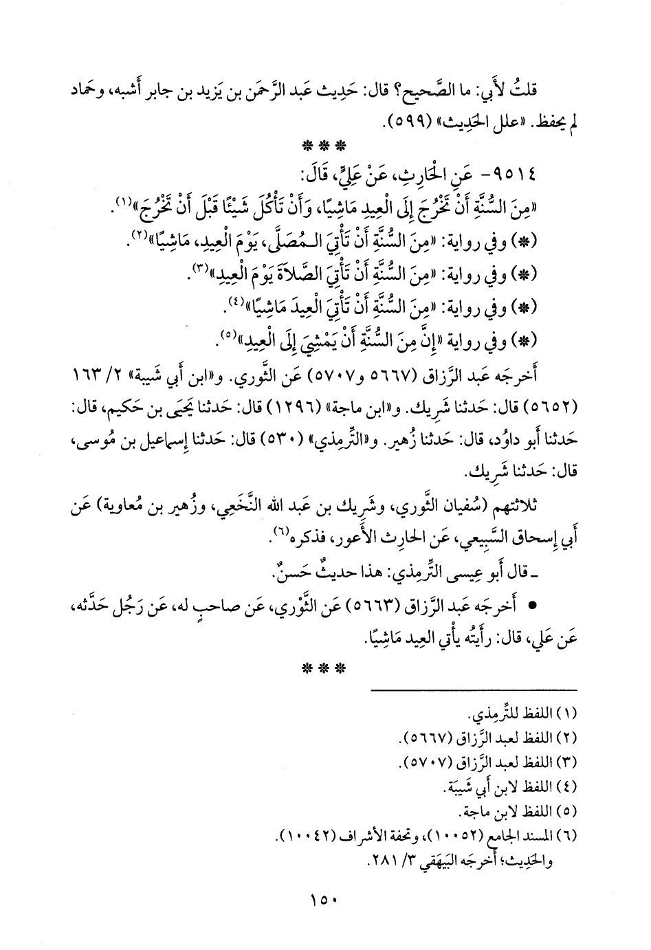 - وفي رواية: «من السنة أن تأتي العيد ماشيا» (¬٤).