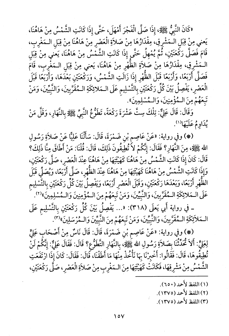 - وفي رواية: «عن عاصم بن ضمرة، قال: قال ناس من أصحاب علي لعلي: ألا تحدثنا بصلاة رسول الله صَلى الله عَليه وسَلم بالنهار التطوع؟ قال: فقال علي: إنكم لن تطيقوها، قال: فقالوا: أخبرنا بها نأخذ منها ما أطقنا، قال: فقال: كان إذا ارتفعت الشمس من مشرقها، فكانت كهيئتها من المغرب من صلاة العصر، صلى ركعتين،