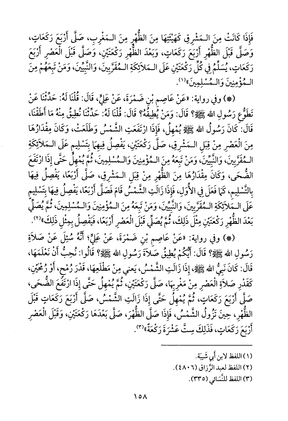 - وفي رواية: «عن عاصم بن ضمرة، قال: سألت علي بن أبي طالب، عن صلاة رسول الله صَلى الله عَليه وسَلم من النهار، بعد المكتوبة؟ قال: ومن يطيق ذلك، ثم أخبره، قال: كان يصلي حين ترتفع الشمس ركعتين، وقبل نصف النهار أربع ركعات، يجعل التسليم في آخر ركعة، وقبل الظهر أربع ركعات، يجعل التسليم في آخر ركعة، وبعدها أربع ركعات, يجعل التسليم في آخر ركعة» (¬٣).
