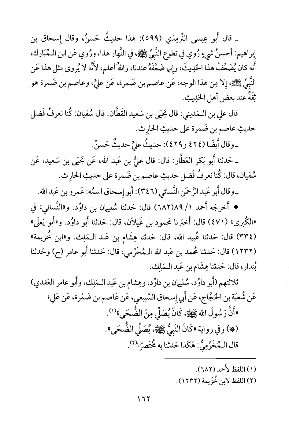ـ قال التِّرمِذي (٥٩٩): هذا حديثٌ حسنٌ، وقال إسحاق بن إبراهيم: أحسن شيء روي في تطوع النبي صَلى الله عَليه وسَلم في النهار هذا، وروي عن ابن المبارك، أنه كان يضعف هذا الحديث، وإنما ضعفه عندنا، والله أعلم، لأنه لا يروى مثل هذا عن النبي صَلى الله عَليه وسَلم إلا من هذا الوجه، عن عاصم بن ضمرة، عن علي، وعاصم بن ضمرة هو ثقة عند بعض أهل الحديث.