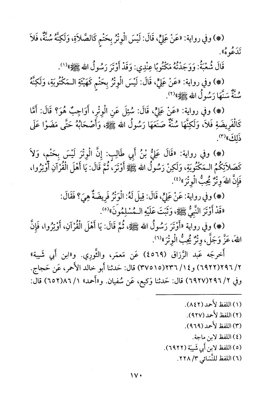 - وفي رواية: «عن علي، قال: سُئِل عن الوتر، أواجب هو؟ قال: أما كالفريضة فلا، ولكنها سنة صنعها رسول الله صَلى الله عَليه وسَلم وأصحابه حتى مضوا على ذلك» (¬١).