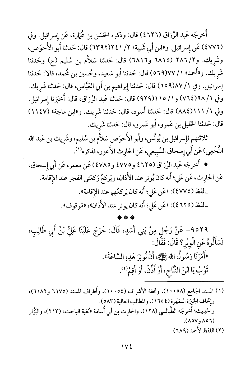 و «ابن أبي شيبة» (٦٣٩٢) قال: حدثنا أَبو الأحوص، وشريك. و ٢/ ٢٨٦ (٦٨١٥ و ٦٨١٦) قال: حدثنا سلام بن سليم (ح) وحدثنا شَريك. و «أحمد» (٥٦٩) قال: حدثنا أَبو سعيد، وحسين بن محمد، قالا: حدثنا إسرائيل. وفي ١/ ٨٧ (٦٥٩) قال: حدثنا إبراهيم بن أبي العباس، قال: حدثنا شَريك. وفي ١/ ٩٨ (٧٦٤) و ١/ ١١٥ (٩٢٩) قال: حدثنا عبد الرزاق، قال: أخبرنا إسرائيل. وفي ١/ ١١١ (٨٨٤) قال: حدثنا أسود، قال: حدثنا شَريك. و «ابن ماجة» (١١٤٧) قال: حدثنا الخليل بن عَمرو، أَبو عَمرو، قال: حدثنا شَريك.