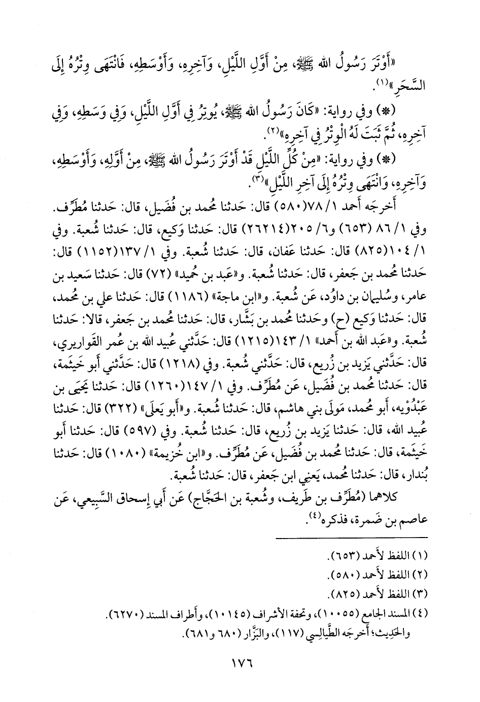 و «عبد الله بن أحمد» ١/ ١٤٣ (١٢١٥) قال: حدثني عُبيد الله بن عمر القواريري، قال: حدثني يزيد بن زُريع، قال: حدثني شعبة. وفي (١٢١٨) قال: حدثني أَبو خيثمة، قال: حدثنا محمد بن فضيل، عن مطرف. وفي ١/ ١٤٧ (١٢٦٠) قال: حدثنا يحيى بن عبدويه، أَبو محمد مولى بني هاشم، قال: حدثنا شعبة. و «أَبو يَعلى» (٣٢٢) قال: حدثنا عُبيد الله، قال: حدثنا يزيد بن زُريع، قال: حدثنا شعبة. وفي (٥٩٧) قال: حدثنا أَبو خيثمة، قال: حدثنا محمد بن فضيل، عن مطرف. و «ابن خزيمة» (١٠٨٠) قال: حدثنا بُندَار، قال: حدثنا محمد، يعني ابن جعفر، قال: حدثنا شعبة.