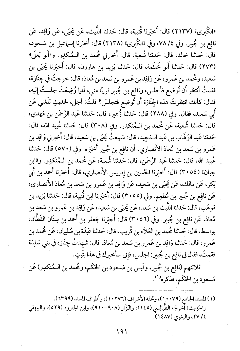 وفي (٢٨٨) قال: حدثنا زهير، قال: حدثنا عبد الرَّحمَن بن مهدي، قال: حدثنا شعبة، عن محمد بن المُنكدِر. وفي (٣٠٨) قال: حدثنا عُبيد الله، قال: حدثنا عبد الوَهَّاب بن عبد المجيد، قال: سمعت يحيى بن سعيد، قال: أخبرني واقد بن عَمرو بن سعد بن معاذ الأَنصاري، أن نافع بن جبير أخبره. وفي (٥٧٠) قال: حدثنا عُبيد الله، قال: حدثنا عبد الرَّحمَن، قال: حدثنا شعبة، عن محمد بن المُنكدِر. و «ابن حِبَّان» (٣٠٥٤) قال: أخبرنا الحسين بن إدريس الأَنصاري، قال: أخبرنا أحمد بن أَبي بكر، عن مالك، عن يحيى بن سعيد، عن واقد بن عَمرو بن سعد بن معاذ الأَنصاري، عن نافع بن جبير بن مطعم. وفي (٣٠٥٥) قال: أخبرنا ابن قتيبة، قال: حدثنا يزيد بن مَوهَب، قال: حدثنا الليث بن سعد، عن يحيى بن سعيد، عن واقد بن عَمرو بن سعد بن معاذ، عن نافع بن جبير. وفي (٣٠٥٦) قال: أخبرنا جعفر بن أحمد بن سنان القطان، بواسط، قال: حدثنا محمد بن العلاء بن كُريب، قال: حدثنا عَبدة بن سليمان، عن محمد بن عَمرو، قال: حدثنا واقد بن عَمرو بن سعد بن معاذ، قال: شهدت جِنازة في بني سلمة فقمت، فقال لي نافع بن جبير: اجلس، فإني سأخبرك في هذا بثبت.