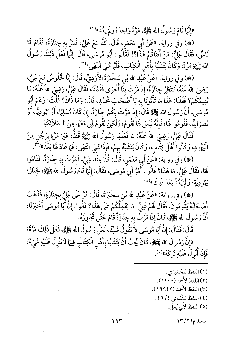 - وفي رواية: «عن أبي معمر، قال: كنا عند علي، فمرت به جِنازة، فقاموا لها، فقال علي: ما هذا؟ قالوا: أمر أبي موسى، فقال: إنما قام رسول الله صَلى الله عَليه وسَلم لجِنازة يهودية، ولم يعد بعد ذلك» (¬١).