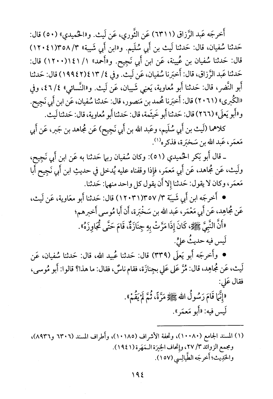 - قال أَبو بكر الحُميدي (٥١): وكان سفيان ربما حدثنا به عن ابن أَبي نَجيح، وليث، عن مجاهد، عن أبي معمر، فإذا وقفناه عليه يدخل في حديث ابن أَبي نَجيح أبا معمر، وكان لا يقول: حدثنا إلا أن يقول كل واحد منهما: حدثنا.