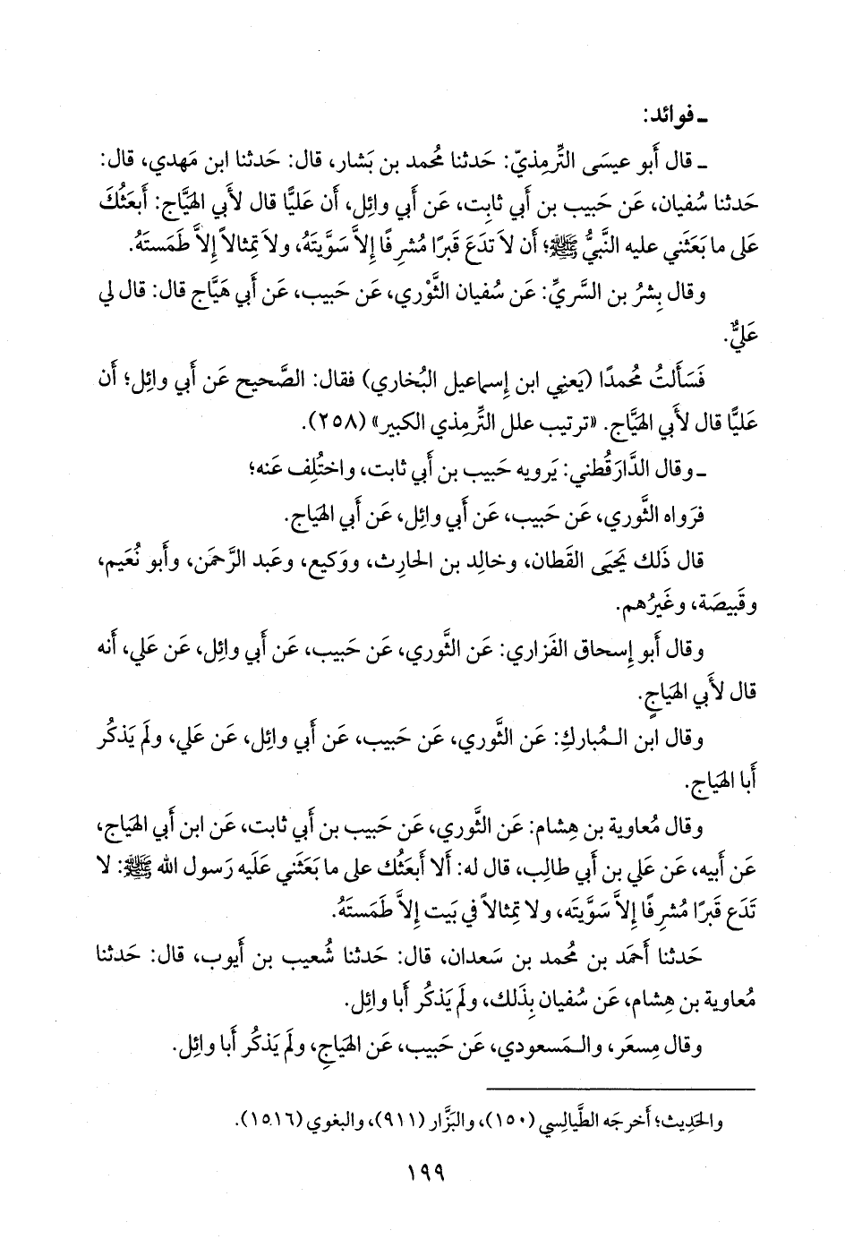 - قال التِّرمِذي: حدثنا محمد بن بشار، قال: حدثنا ابن مهدي، قال: حدثنا سفيان، عن حبيب بن أبي ثابت، عن أبي وائل، أن عليا قال لأبي الهياج: أبعثك على ما بعثني عليه النبي صَلى الله عَليه وسَلم؛ أن لا تدع قبرا مشرفا إلا سويته، ولا تمثالا إلا طمسته.