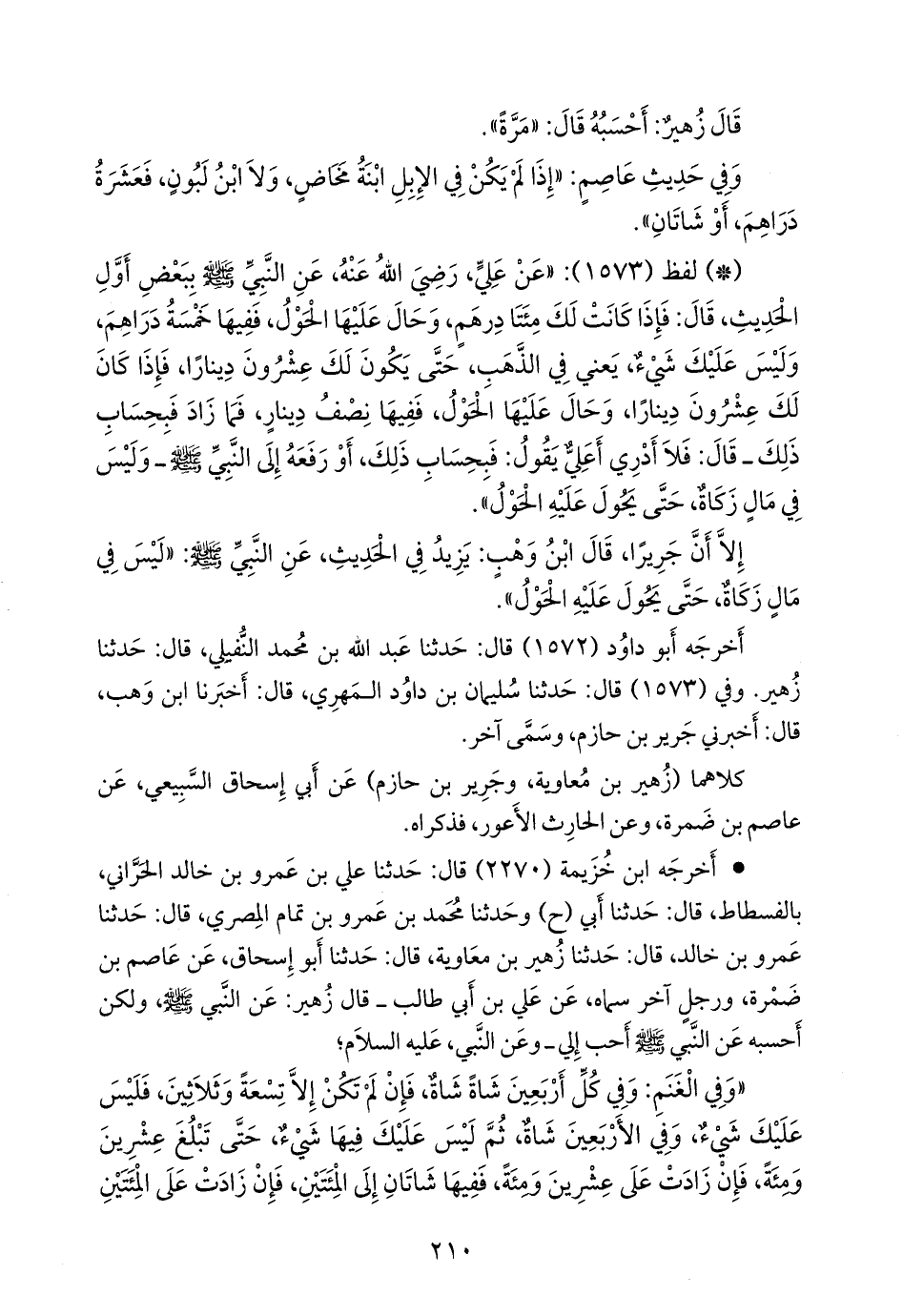 - لفظ (١٥٧٣): «عن علي، رضي الله عنه، عن النبي صَلى الله عَليه وسَلم ببعض أول الحديث، قال: فإذا كانت لك مئتا درهم، وحال عليها الحول، ففيها خمسة دراهم، وليس عليك شيء، يعني في الذهب، حتى يكون لك عشرون دينارا، فإذا كان لك عشرون دينارا، وحال عليها الحول، ففيها نصف دينار، فما زاد فبحساب ذلك ـ قال: فلا أدري أعلي يقول: فبحساب ذلك، أو رفعه إلى النبي صَلى الله عَليه وسَلم وليس في مال زكاة، حتى يحول عليه الحول».