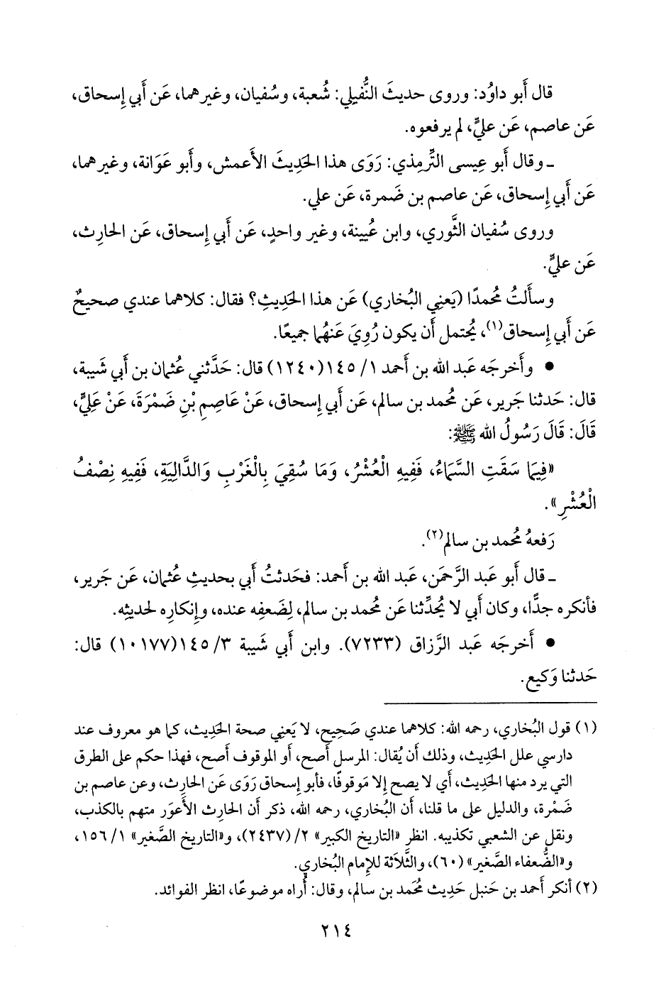 (¬١) قول البخاري، رحمه الله: كلاهما عندي صحيح، لا يعني صحة الحديث، كما هو معروف عند دارسي علل الحديث، وكذلك أن يقال: المرسل أصح، أو الموقوف أصح، فهذا حكم على الطرق التي يرد منها الحديث، أي لا يصح إلا موقوفًا، أو مُرسَلا، مع أن الموقوف والمرسل لا تقومُ بهما حُجَّة، ولا يُبنَى عليهما حُكم، وبيان أن هذا أصح طريق ورد منه الحديث، وإن كان ضعيفًا، فأبو إِسحاق روى عن الحارث، وعن عاصم بن ضَمرة، والدليل على ما قلنا، أن البخاري، رحمه الله، ذكر أن الحارث الأعور متهم بالكذب. انظر «التاريخ الكبير» ٢/ ٢٧٣، و «التاريخ الأوسط» ٢/ ٨٧٥، و «الضعفاء الصغير» (٦٠)، والثلاثة للبخاري.