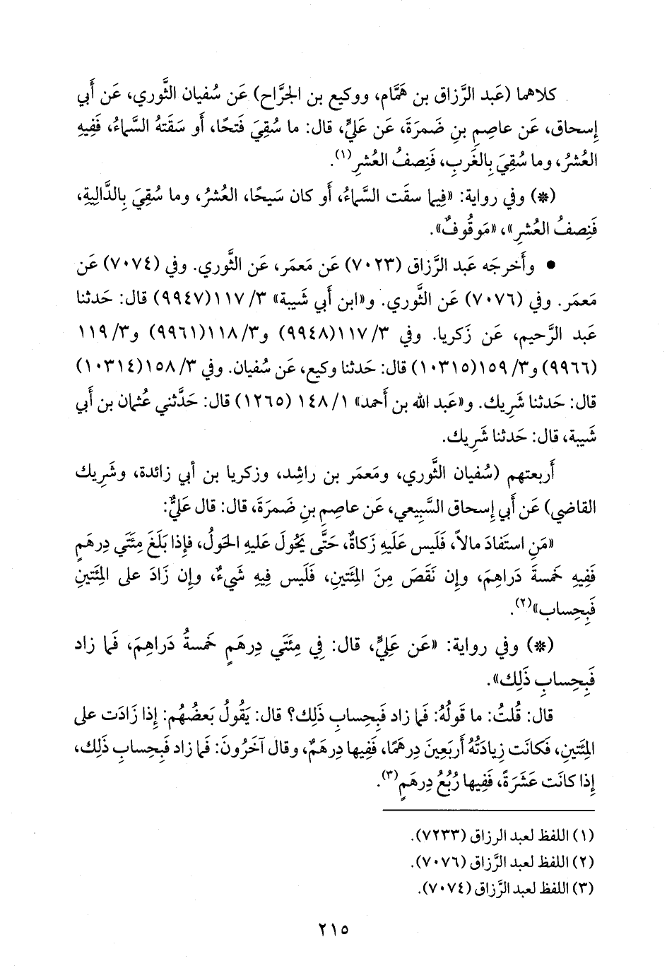 أربعتهم (سفيان الثوري، ومَعمَر بن راشد، وزكريا بن أبي زائدة, وشريك القاضي) عن أبي إسحاق السبيعي، عن عاصم بن ضمرة، قال: قال علي: